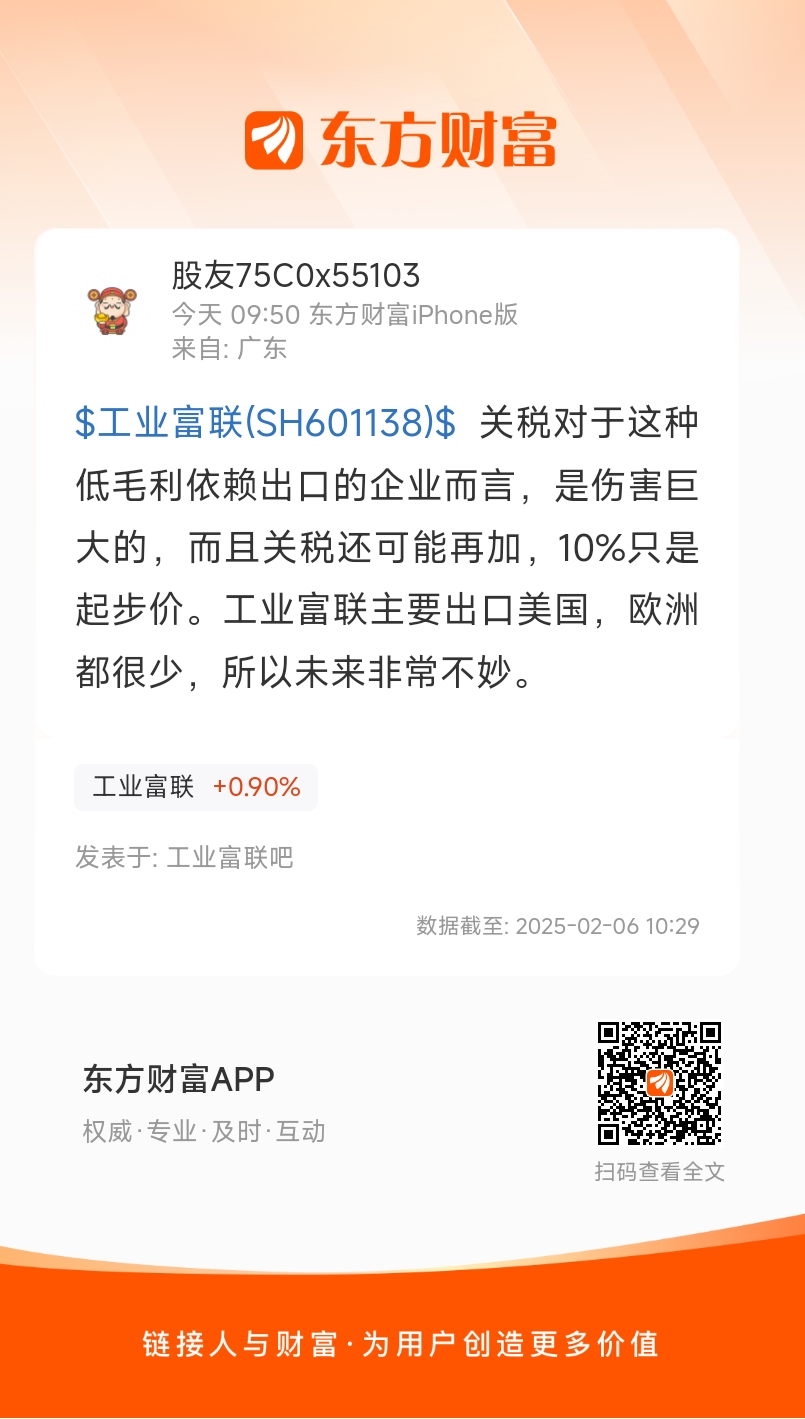 $工业富联(SH601138)$ 关税对于这种低毛利依赖出口的企业而言,是伤害巨大的,而且关税还可能再加,10%只是起步价。工业富联主要出口美国,欧洲都很少,所以未来非常不妙。