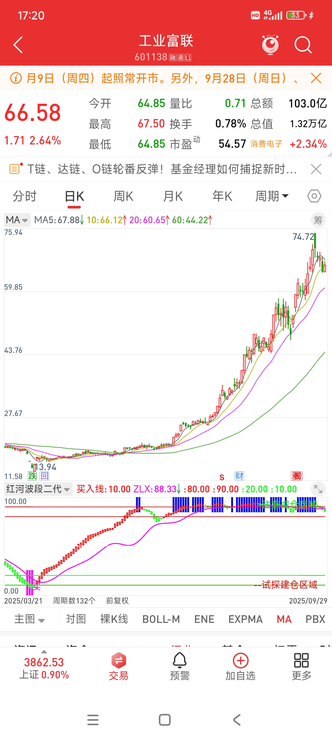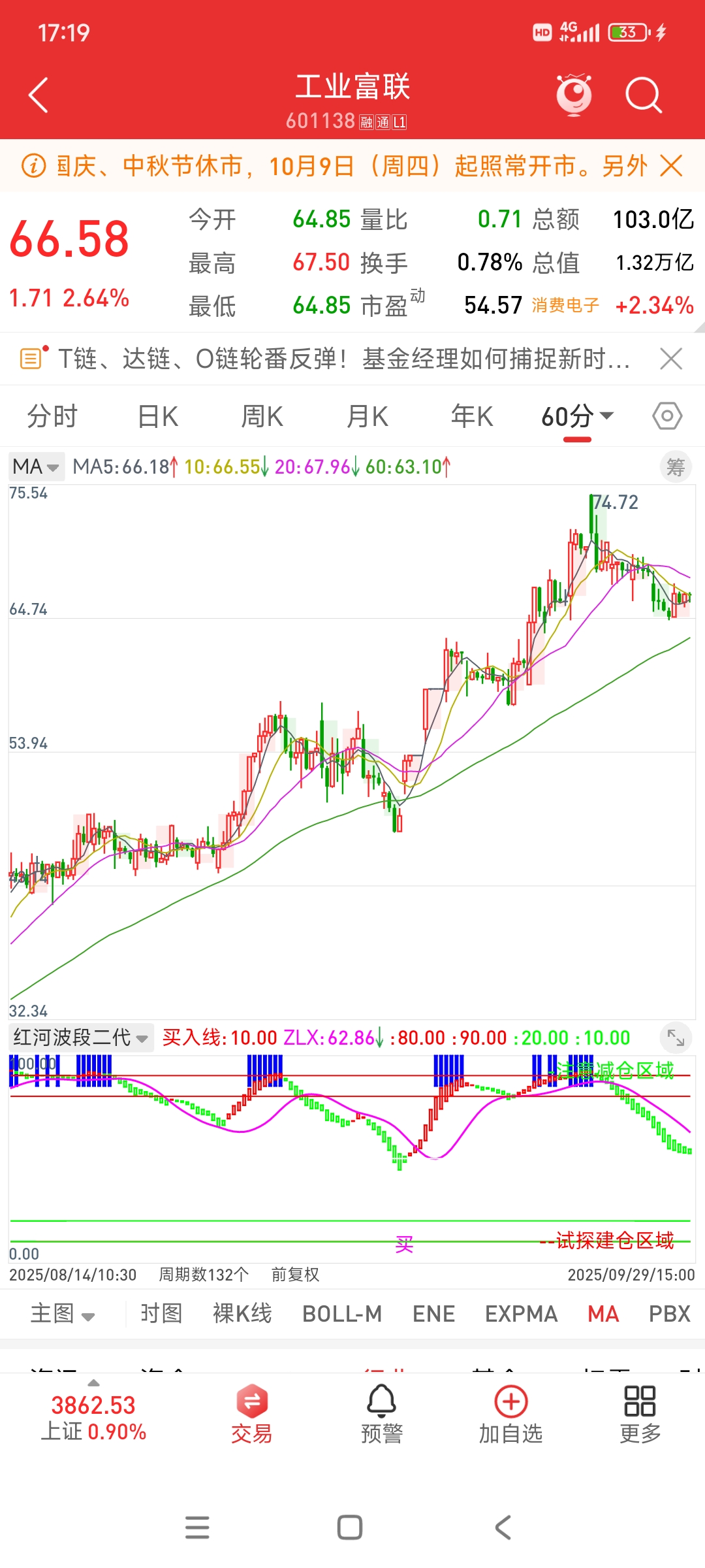 $工业富联(SH601138)$ 今天反弹只是得益于15分钟级别跳买字加上底部绿柱转红柱罢了,但是比它更大级别的周期,60分钟线和日线还都是绿柱延续哦,而且也没有跳买字,所以这里我只看反弹而不是反转,继续耐心等待,注意风险。毕竟绿柱不停,下行不止,绿柱拉长,崩溃不止,继续看