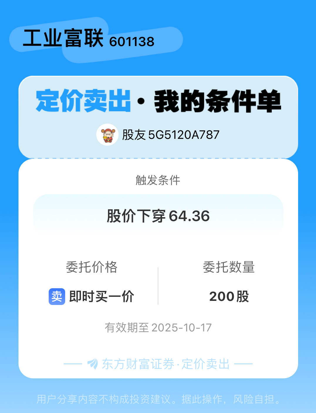 #条件单交流# #定价卖出晒单# 一位股神设置了一个定价卖出条件单,接下来就是见证奇迹的时刻~$工业富联(SH601138)$