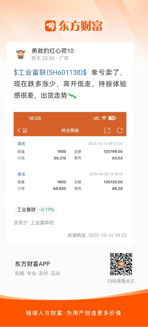 $工业富联(SH601138)$  幸亏卖了,现在跌多涨少,高开低走,持股体验感很差,出货走势