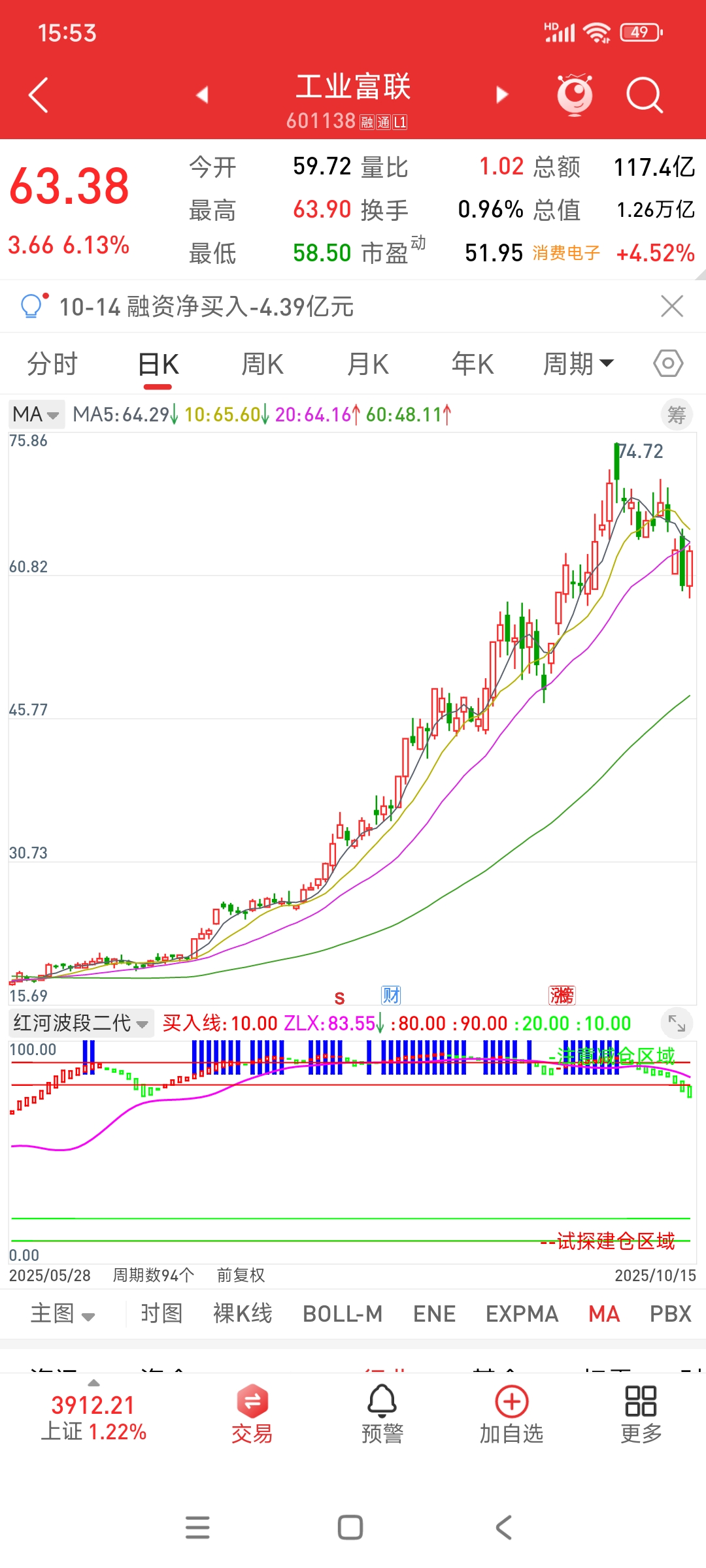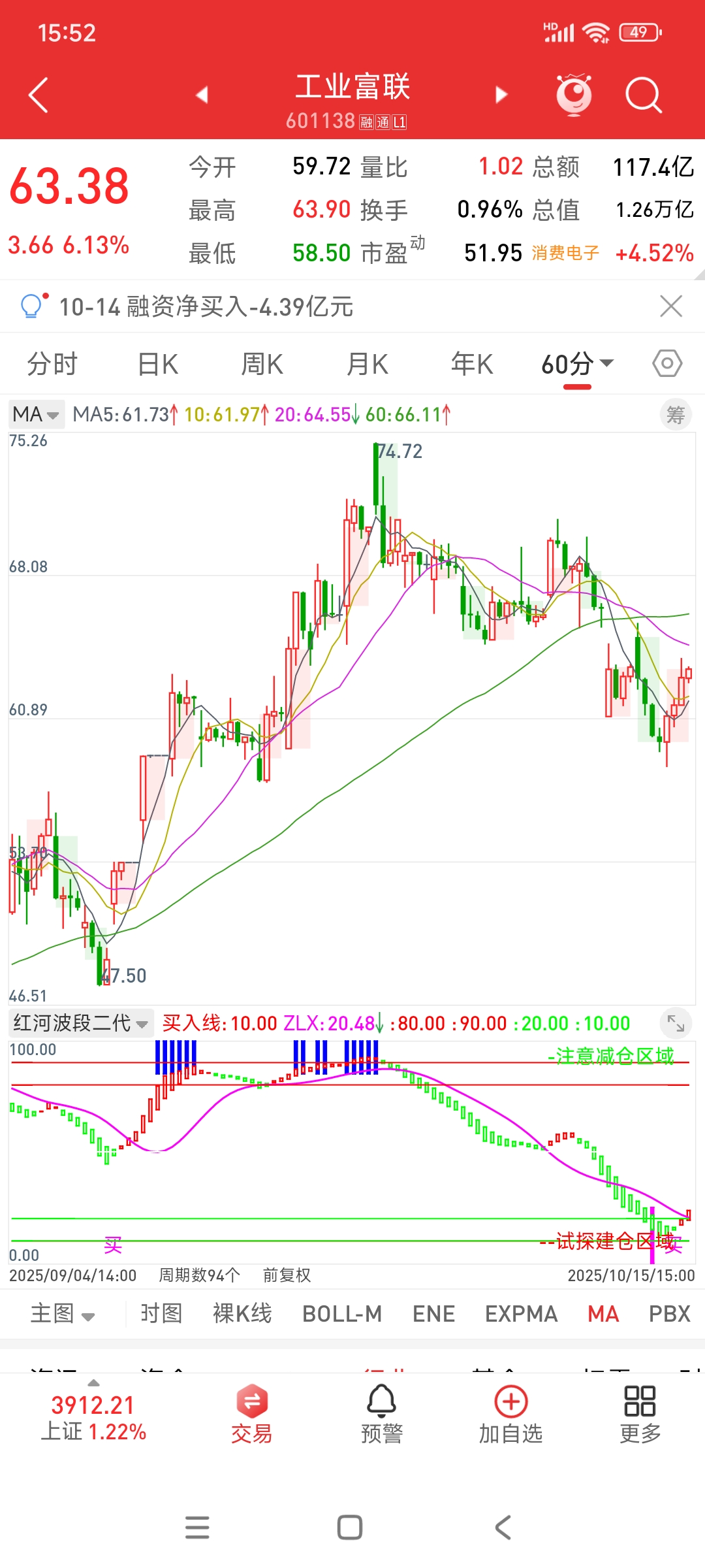 $工业富联(SH601138)$ 底部跳了买字以后出现绿柱转红柱的情况,说明反弹开启,但是日线级别还是绿柱延续,所以这里有买的,注意60分钟级别红柱转绿柱就撤了。因为大级别还是绿柱,大级别压制小级别,所以这里只能判定为反弹而不是反转。