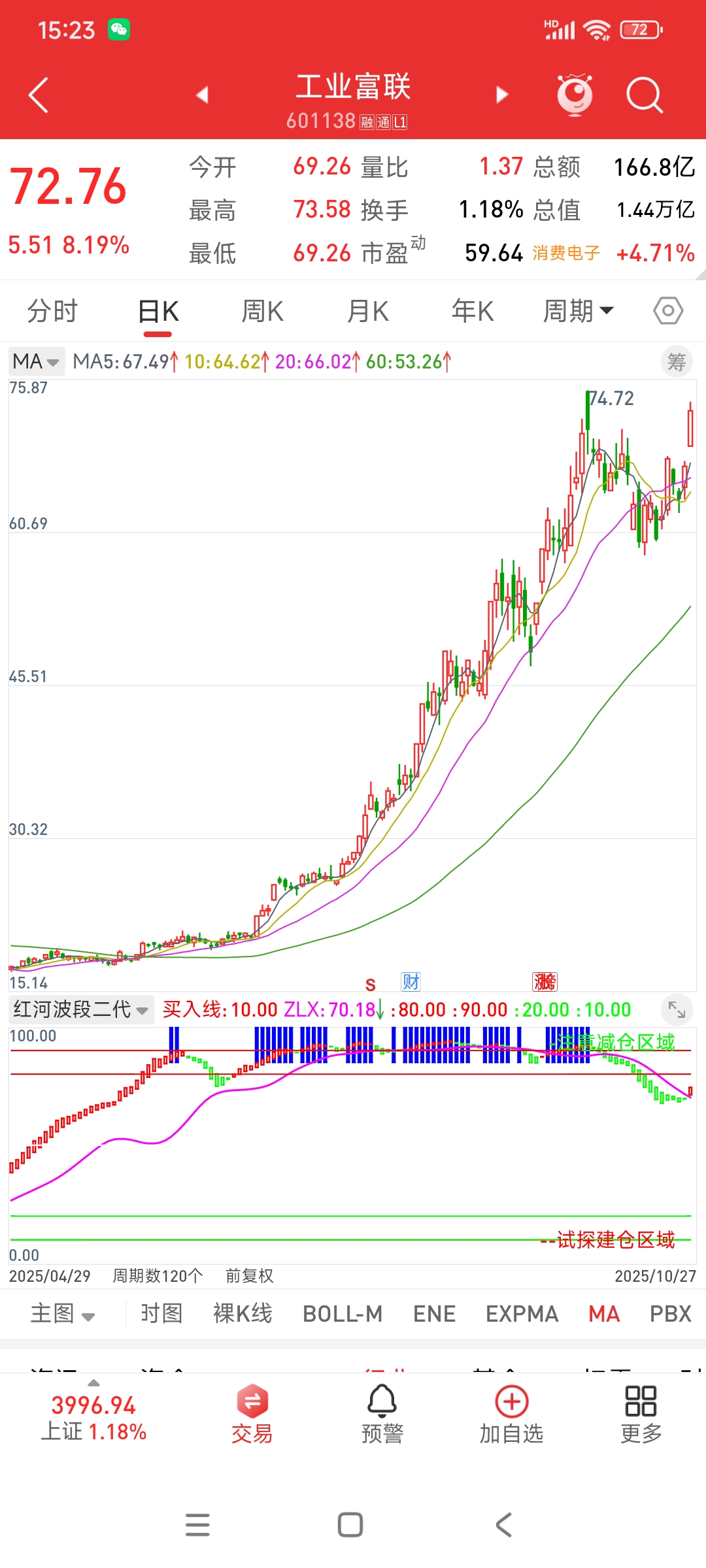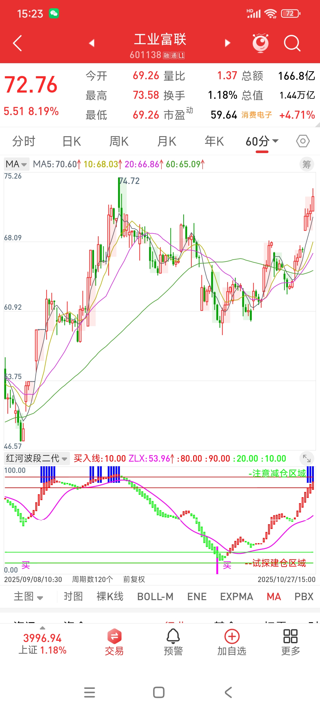 $工业富联(SH601138)$ 有些行情就是这样的,如果从日线来看,今天才右侧确认上涨,但是从60分钟来看,最低点出现买字加上底部绿转红,然后一路拉升。这种就是小级别反转带动大级别去运行,目前看还能继续涨,那就不说了,毕竟红柱不停,上涨不止,红柱拉长,加速不止,继续冲