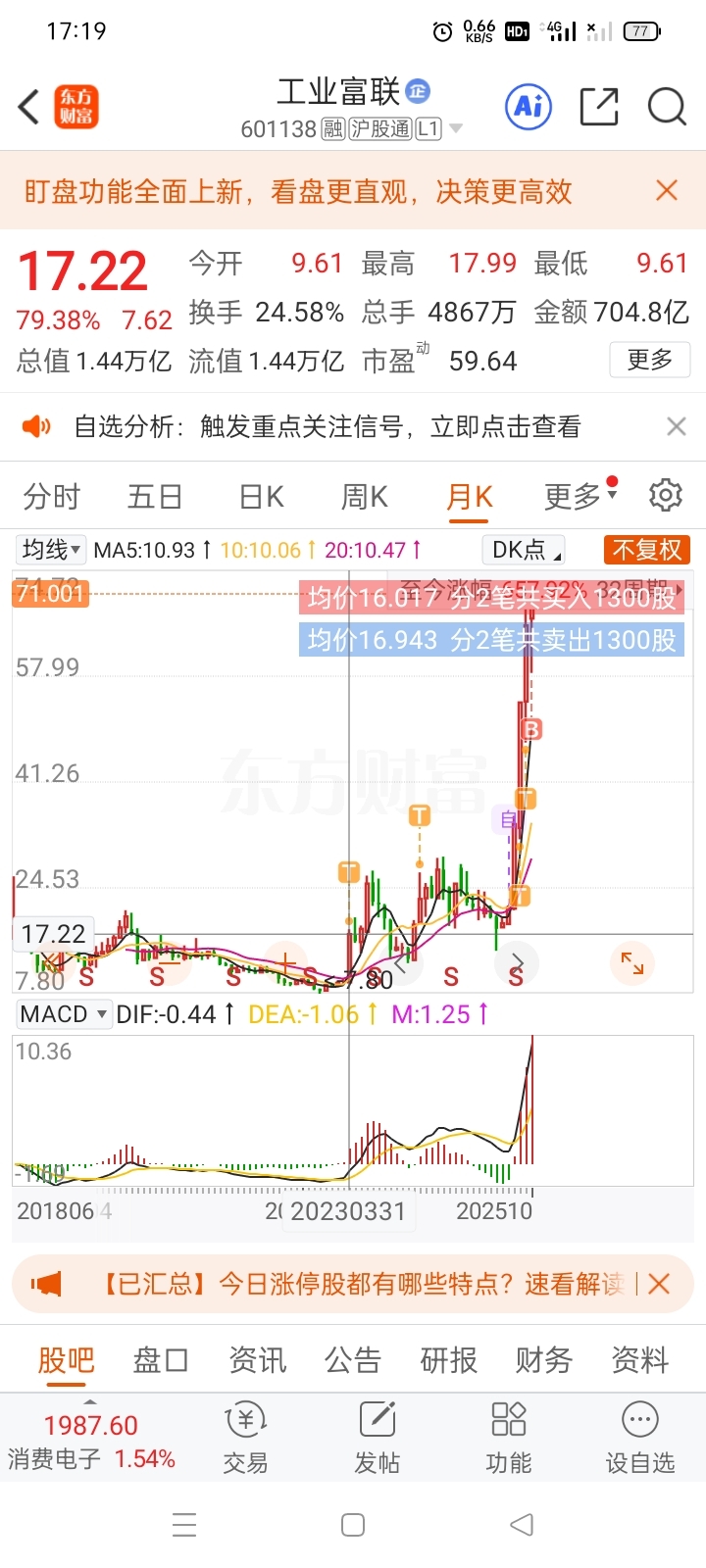 $工业富联(SH601138)$ 明天涨停突破前高,年底上100可怜的散户。拿不住