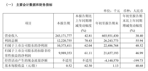 工业富联(601138)10月29日晚间发布2025年三季报,公司第三季度实现营业收入2431.72亿元,同比增长42.81%;归属于上市公司股东的净利润为103.73亿元,同比增长62.04%。前三季度累计实现营业收入6039.31亿元,同比增长38.40%;归属于上市公司股东的净利润为224.87亿元,同比增长48.52%。