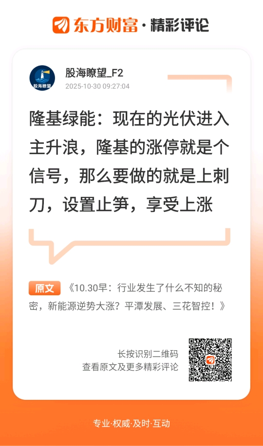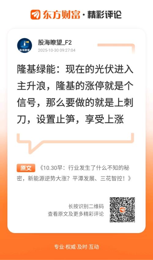 $隆基绿能(SH601012)$隆基绿能 :个股在昨天当中出现了早盘逐步攀升向上收出涨停板的走势,主要是消息面上面来讲,传出了当前头部的各家企业签署了联名的协议,整体的支持整个光伏行业的反内卷,并且控制产能的因素。所以光伏的整个硅片以及各类材料的价格出现了稳步攀升的情况,所以公司也很容易形成触底反弹的情况。昨天的个股也是因此走一波趋势向上的走势以后,向上运行,走出了突破结构形态,目前来讲,在整个大的结构里面,个股的唯一的压制点位在21元的位置,还会有继续上升的动能,现在才刚刚开始,正式进入了主升浪的阶段,适合长线。