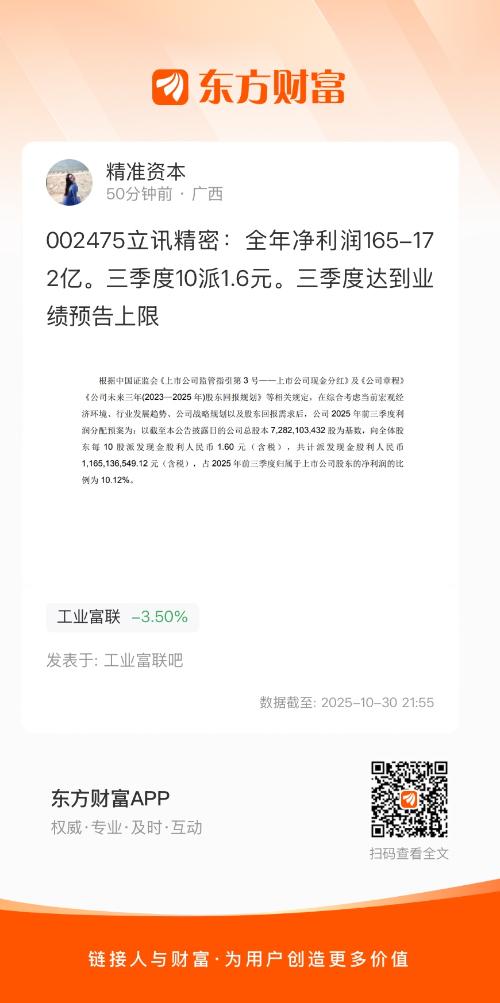 002475立讯精密:全年净利润165-172亿。三季度10派1.6元。三季度达到业绩预告上限