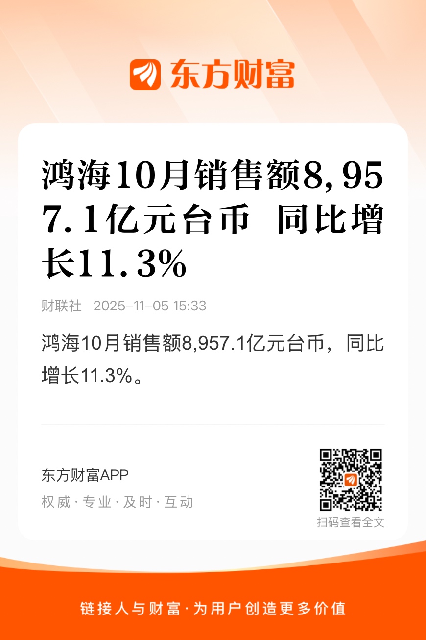 鸿海10月销售额8,957.1亿元台币,同比增长11.3%。