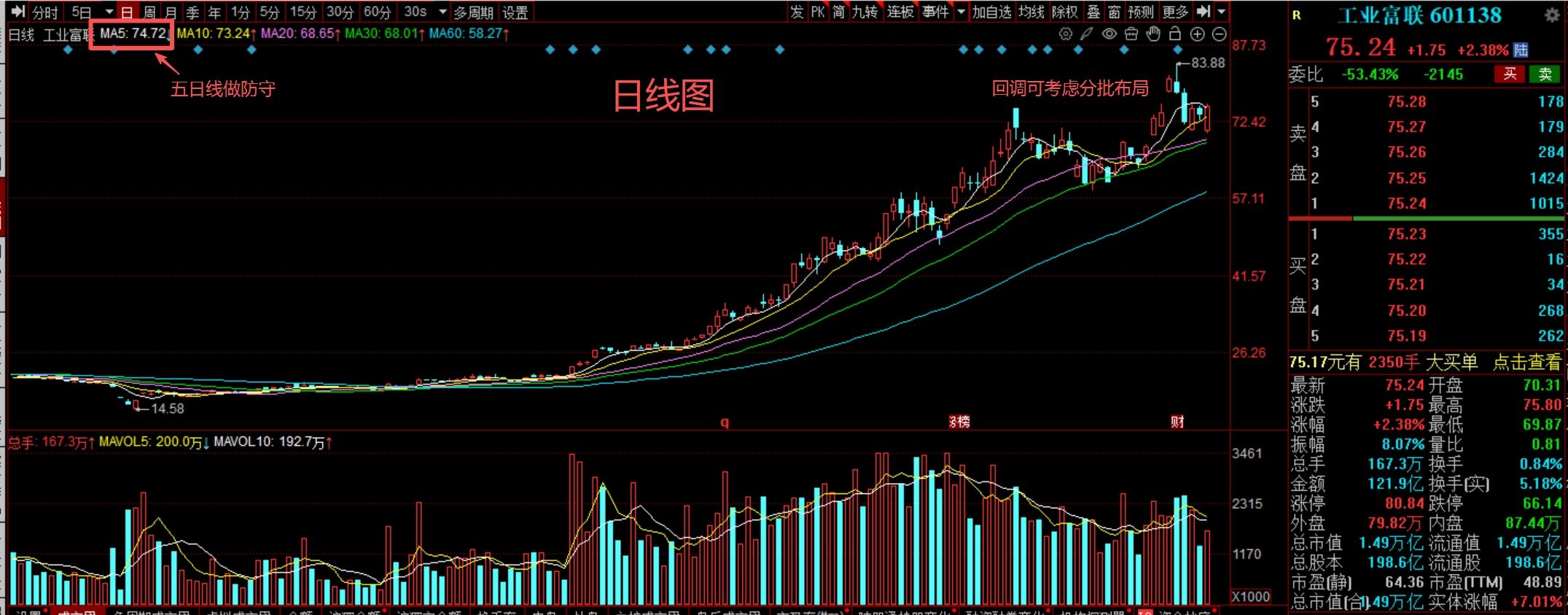 今日温和上涨站稳5日线,整体维持在短期均线上方运行。当前关键观察74.72元(5