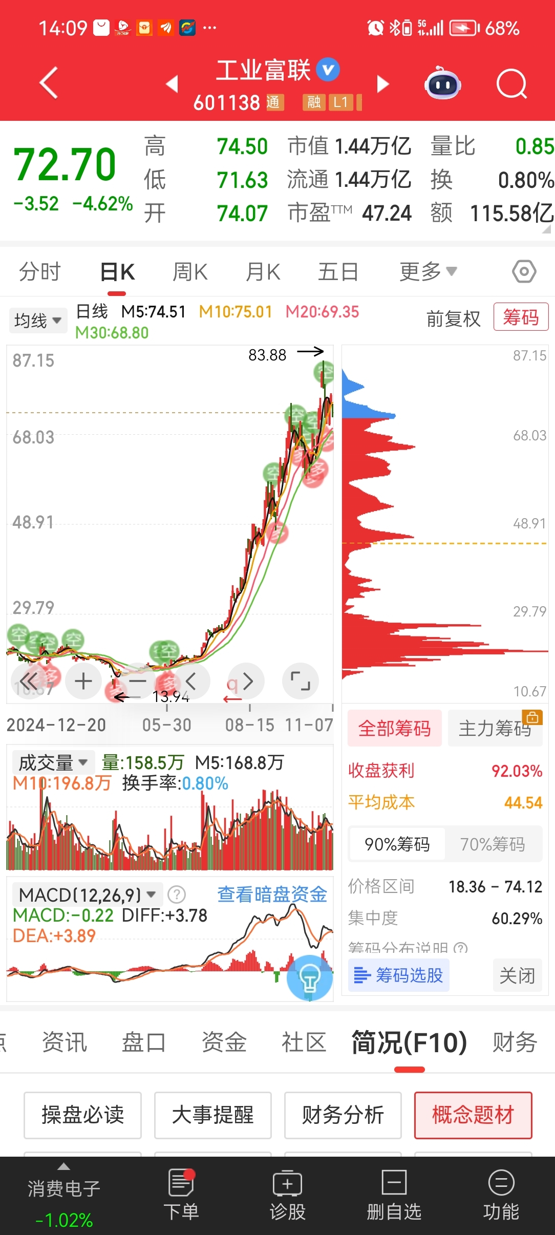 $工业富联(SH601138)$ 本人愚笨的理解,,浅薄的认知,多空区域为分歧区域,就是所谓的震荡区域,和大盘一样,没有偏差, 中间那一段未显示的多空分歧的为主升期,随便怎么调,无所谓,躺平做T!