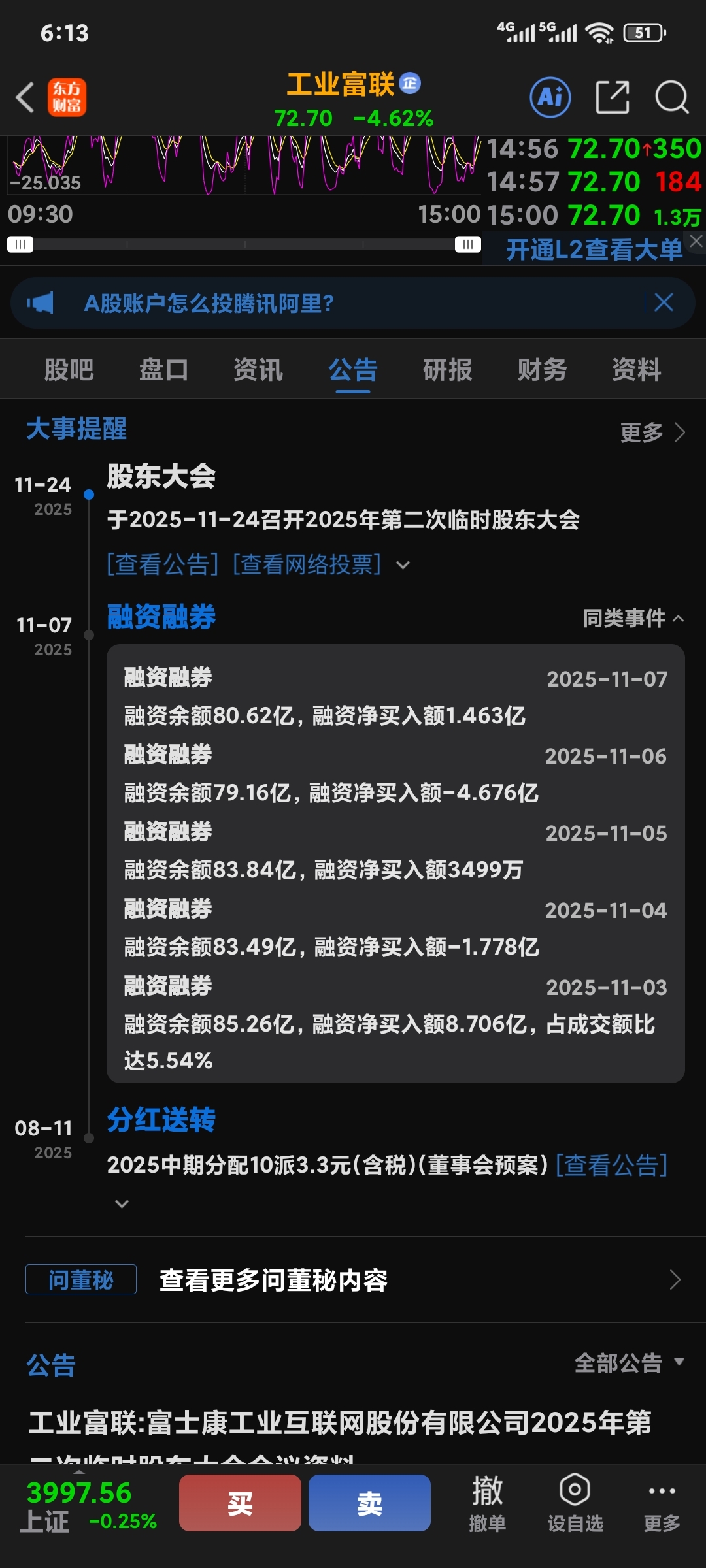 $工业富联(SH601138)$ 11月7日融资1.46亿,10日会跌么?