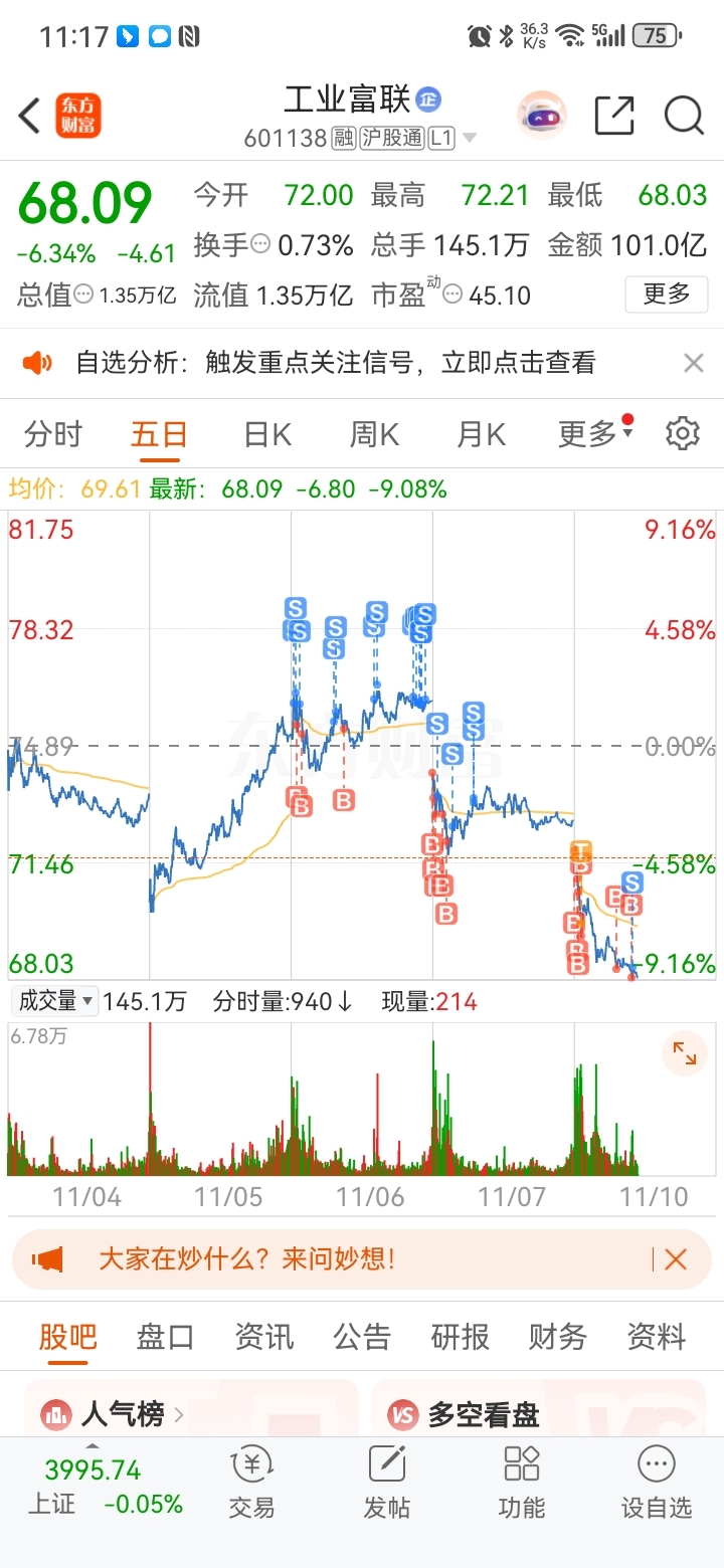 $工业富联(SH601138)$ 上周四要不跑百分之八十的仓位,这几天不知道得亏多惨