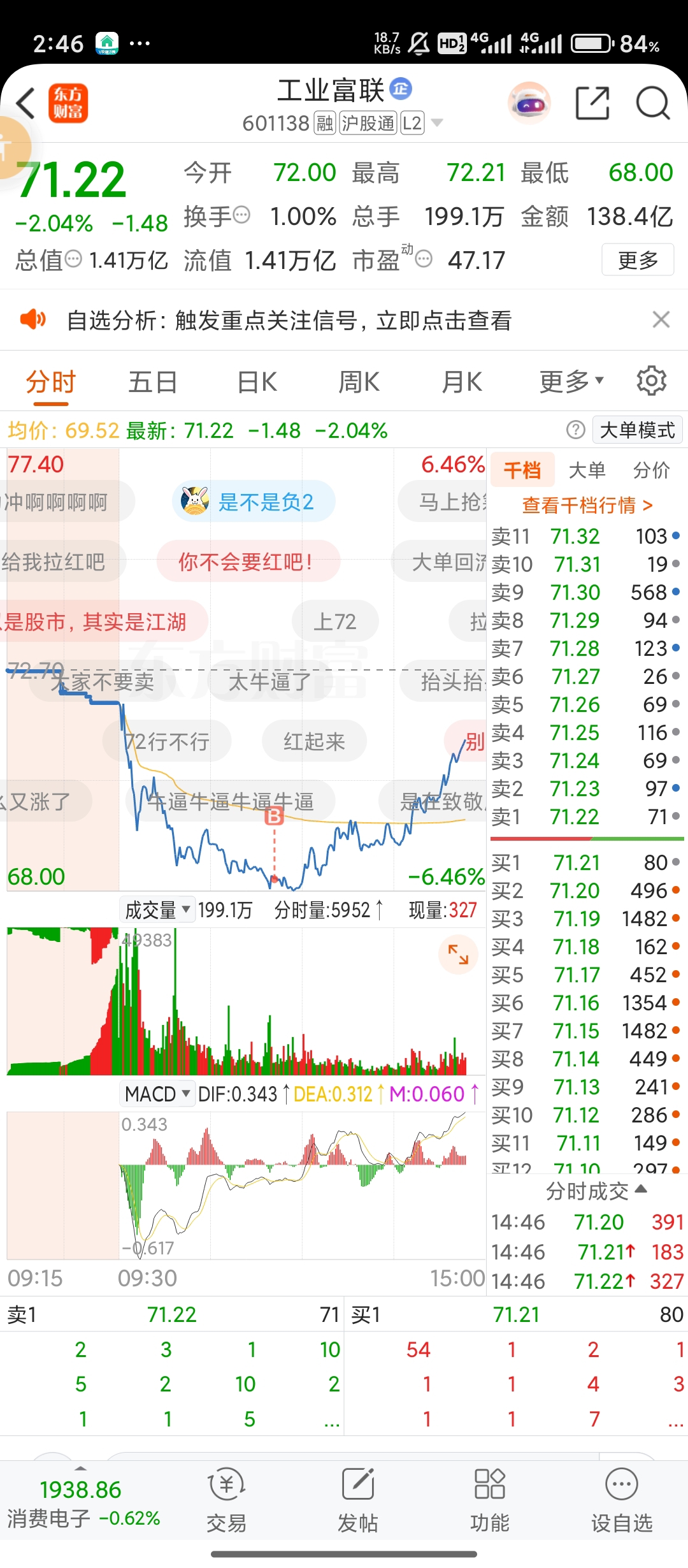 本来不打算买的,毕竟大盘这个位置悬空,但是看到他工业富联这么跌忍不了还是买了一点