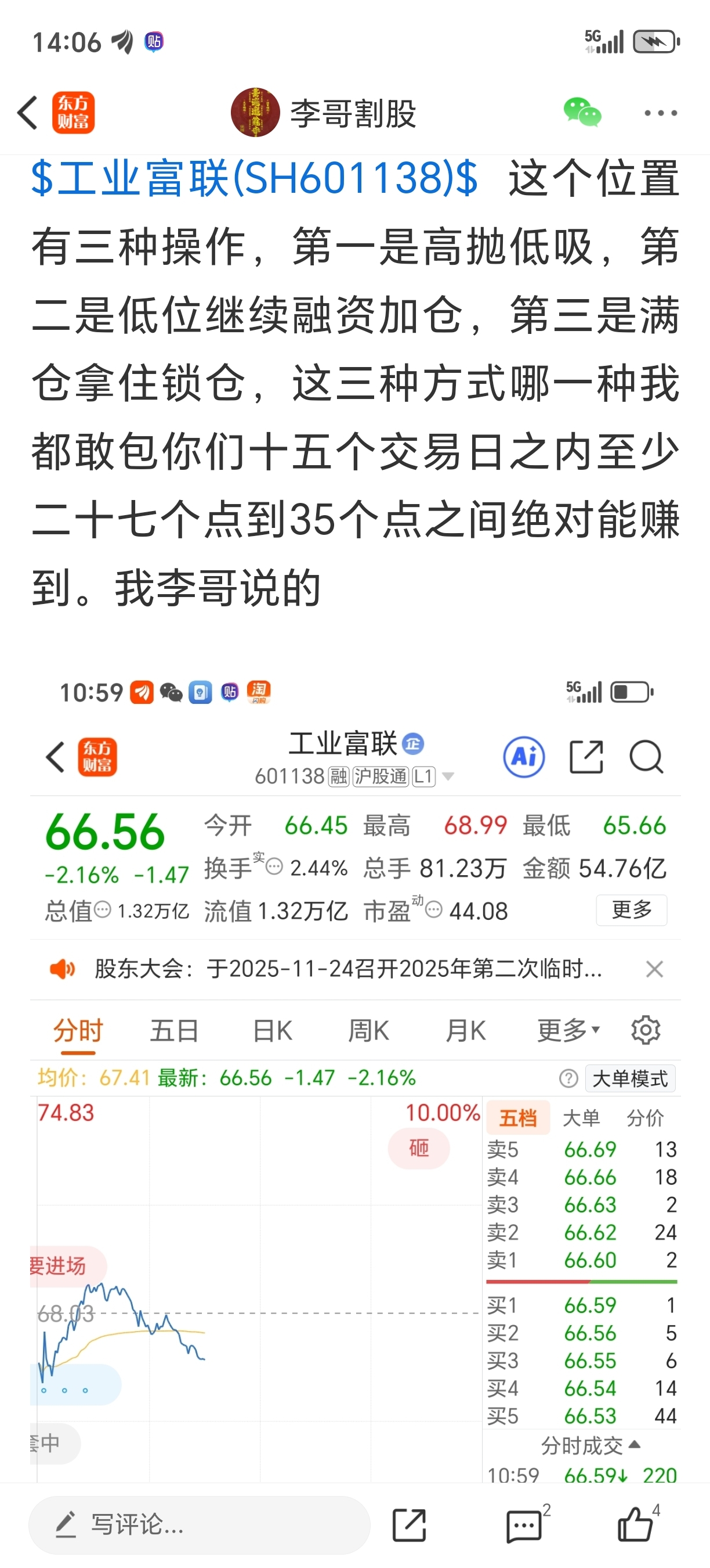 $工业富联(SH601138)$ 李哥割股再次提示今天负2.4个点抄底的明天开盘还有仓位的开盘价直接全仓进,今天进的不要做T,不要卖飞了,明天封板!!!!!!!!...这话是我李哥割股说的明天所有人过来验证我这次让你们一个个心服口服