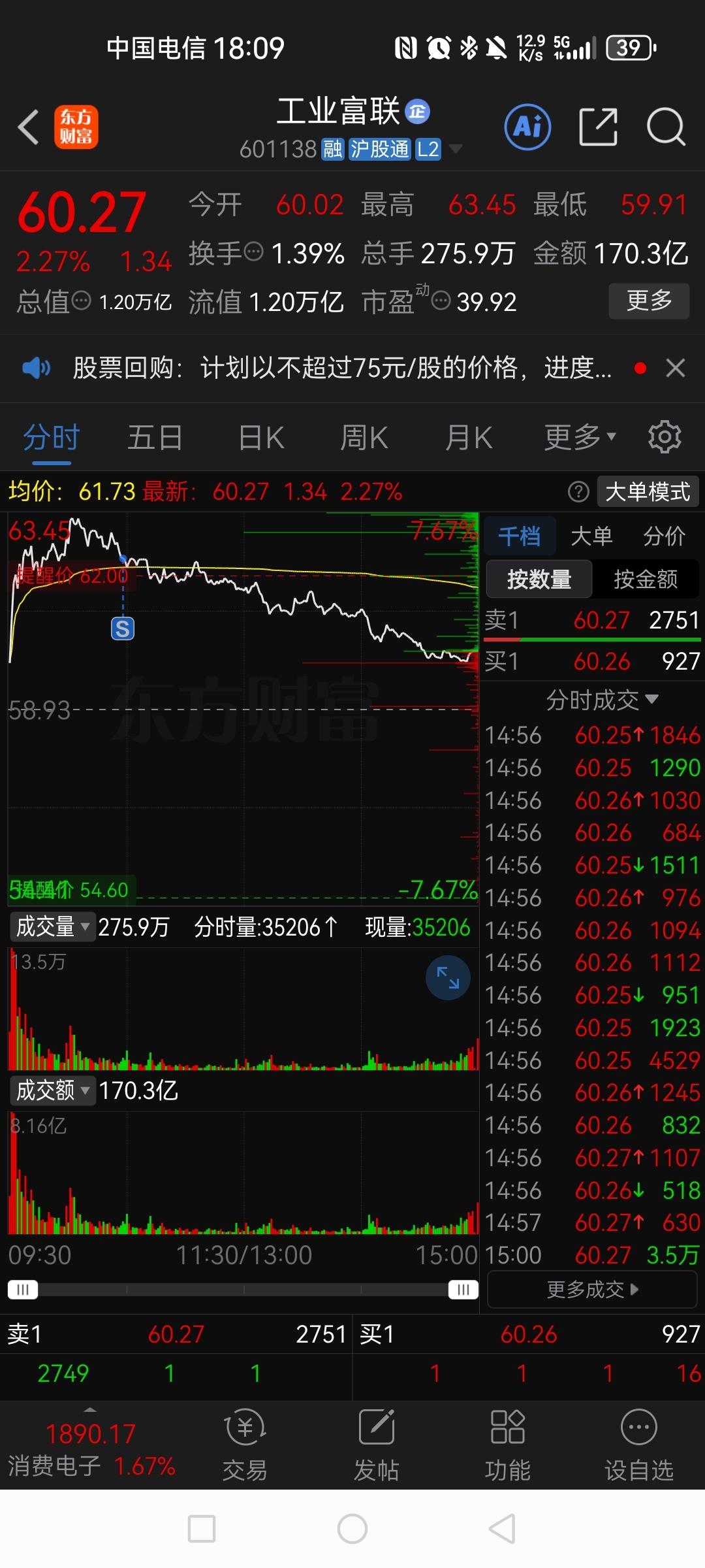 $工业富联(SH601138)$ 这个票只能做t低买高卖,虽然我今天卖了,但是我预感明天还要涨