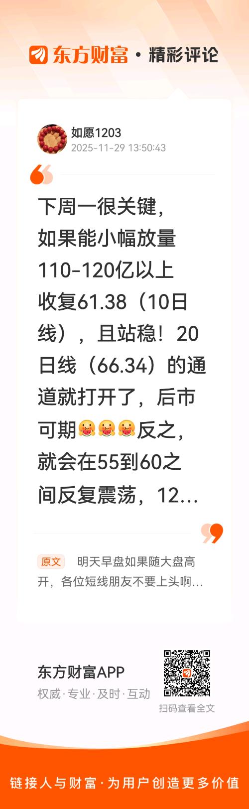 //@如愿1203 :下周一很关键,如果能小幅放量110-120亿以上收复61.38(10日线),且站稳!20日线(66.34)的通道就打开了,后市可期