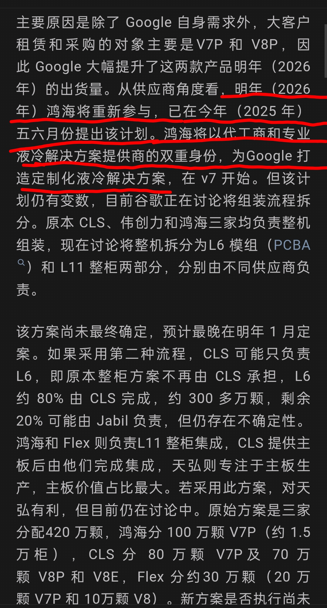 26年,富联将是谷歌服务器最大的代工商。分配到100万颗以上的代工份额。并承担液