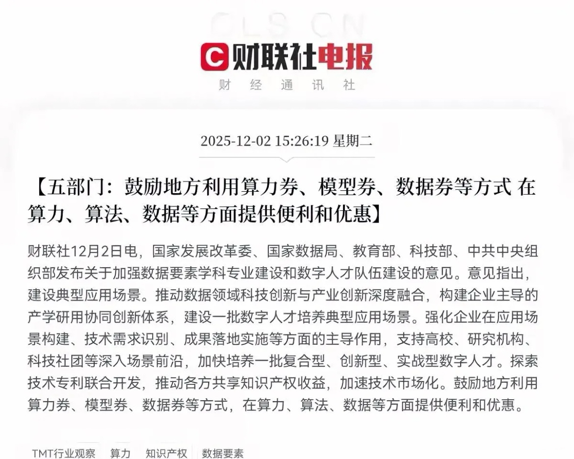 利好总是在盘后!五部门发布政策,核心是通过“算力券、模型券、数据券”的补贴工具,