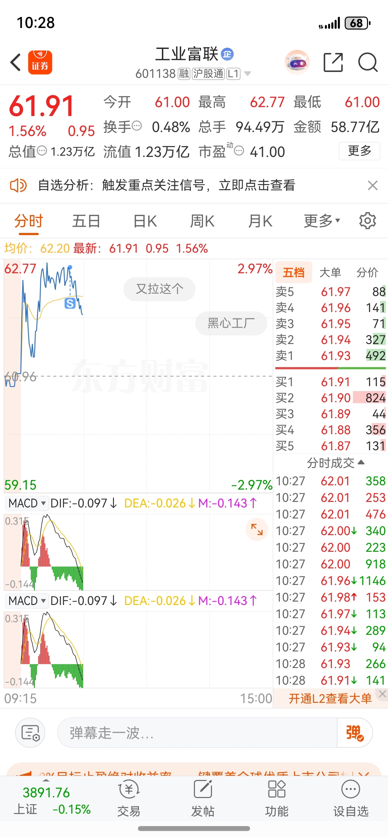 $工业富联(SH601138)$ 62.65减半仓,尾盘看看,明天周四还是值得再入的