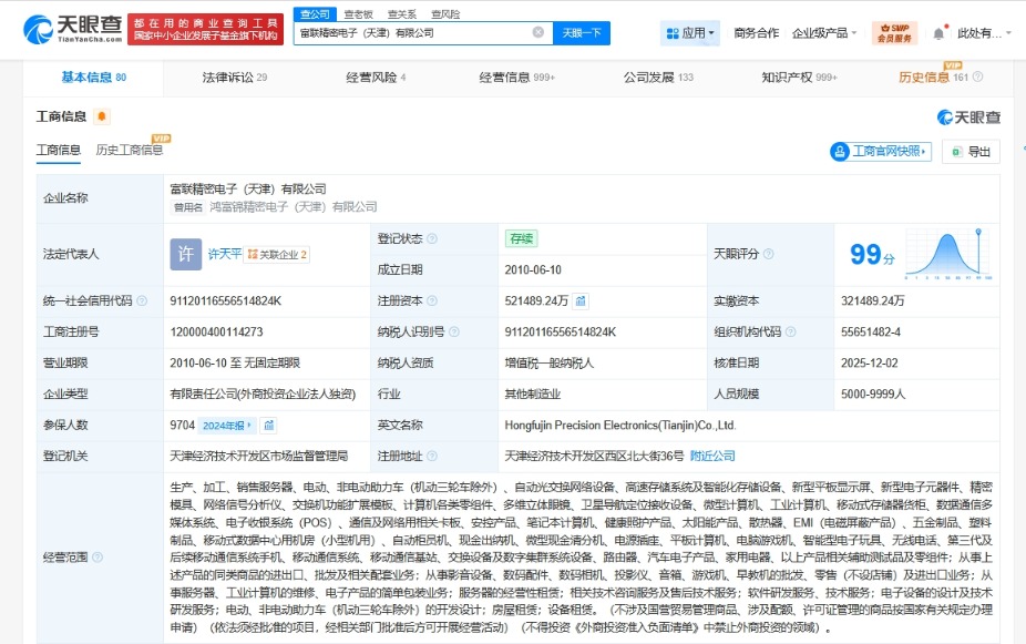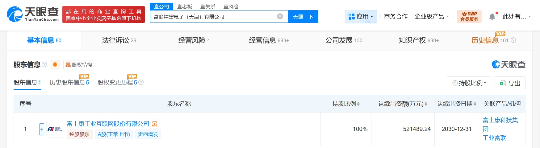 工业富联旗下天津精密电子公司增资至52.15亿元
