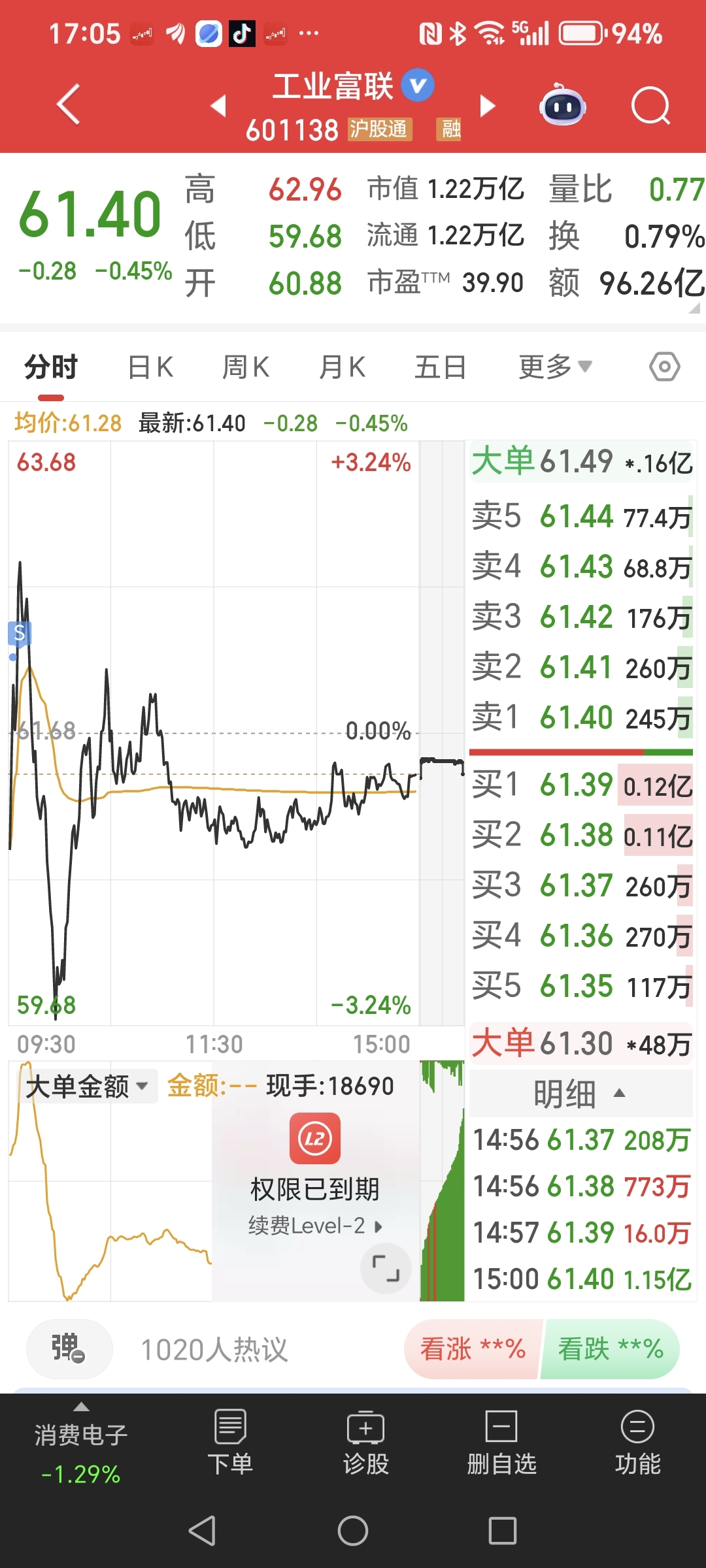$工业富联(SH601138)$ 今天工业富联清仓早早卖了!60下方后悔没买唉