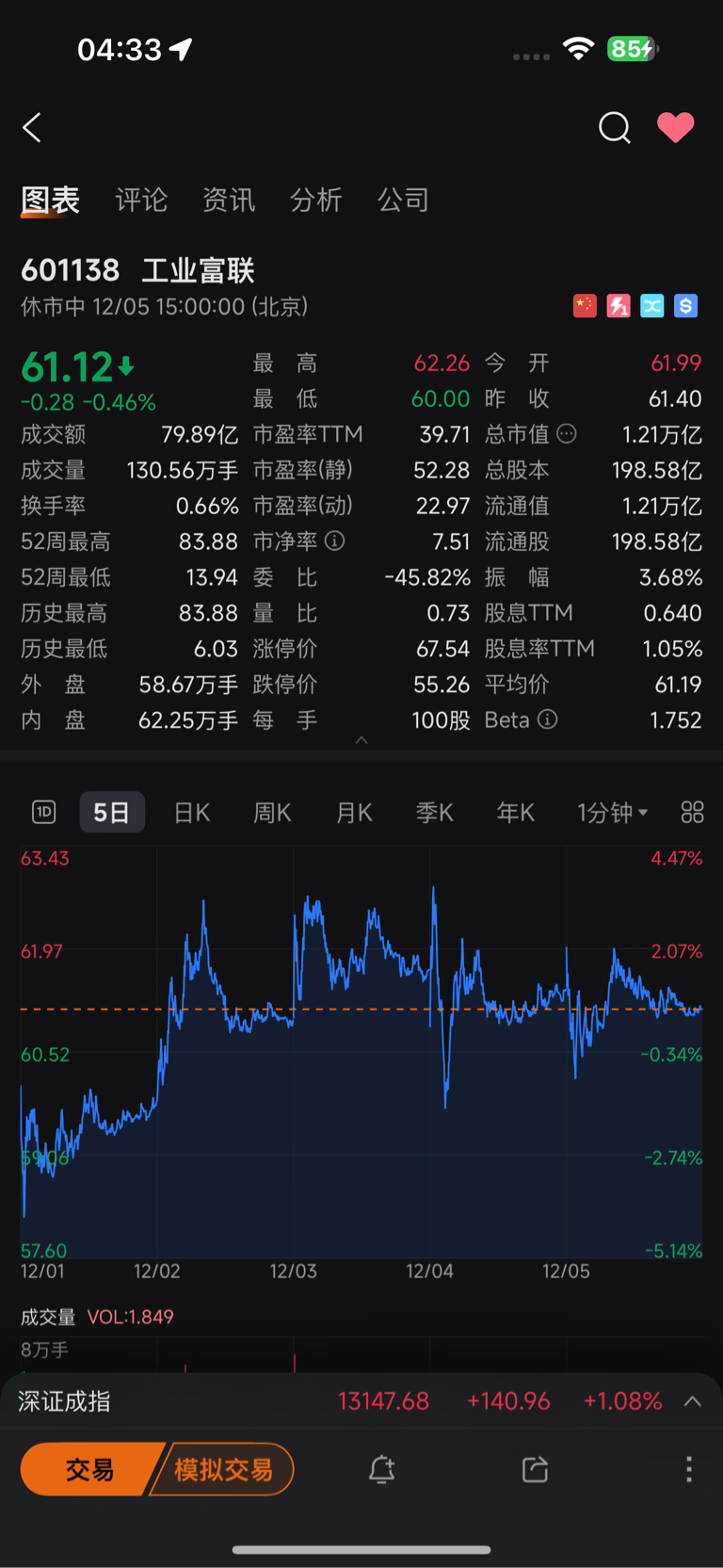 $工业富联(SH601138)$ 61的价格对应远期动态市盈率22.97