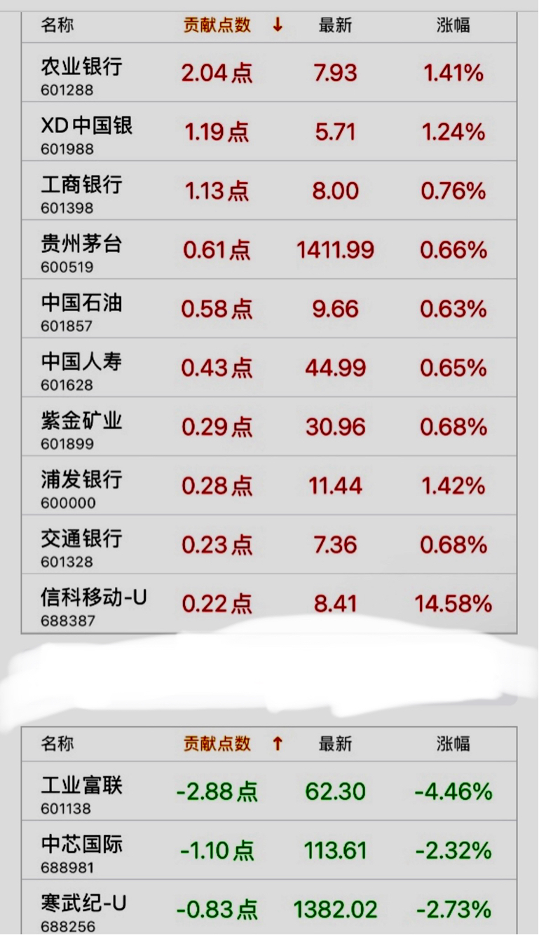 $工业富联(SH601138)$ 全网都在喷富联:12月11号对上证指数贡献点数最多的个股是农业银行,贡献2.04点,该股当日涨1.41%;