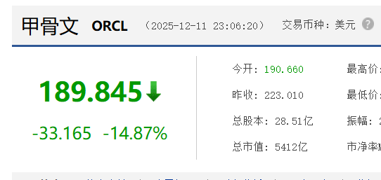 AI风险加剧,订单积压,支出增加。甲骨文盘中暴跌15%