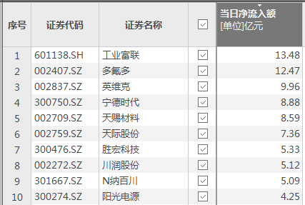 上证报中国证券网讯(记者李雨琪)Choice数据显示,12月23日,资金净流入额前十的个股为工业富联、多氟多、英维克、宁德时代、天赐材料、天际股份、胜宏科技、川润股份、N纳百川、阳光电源。其中,工业富联获净流入13.48亿元,居所有个股首位。