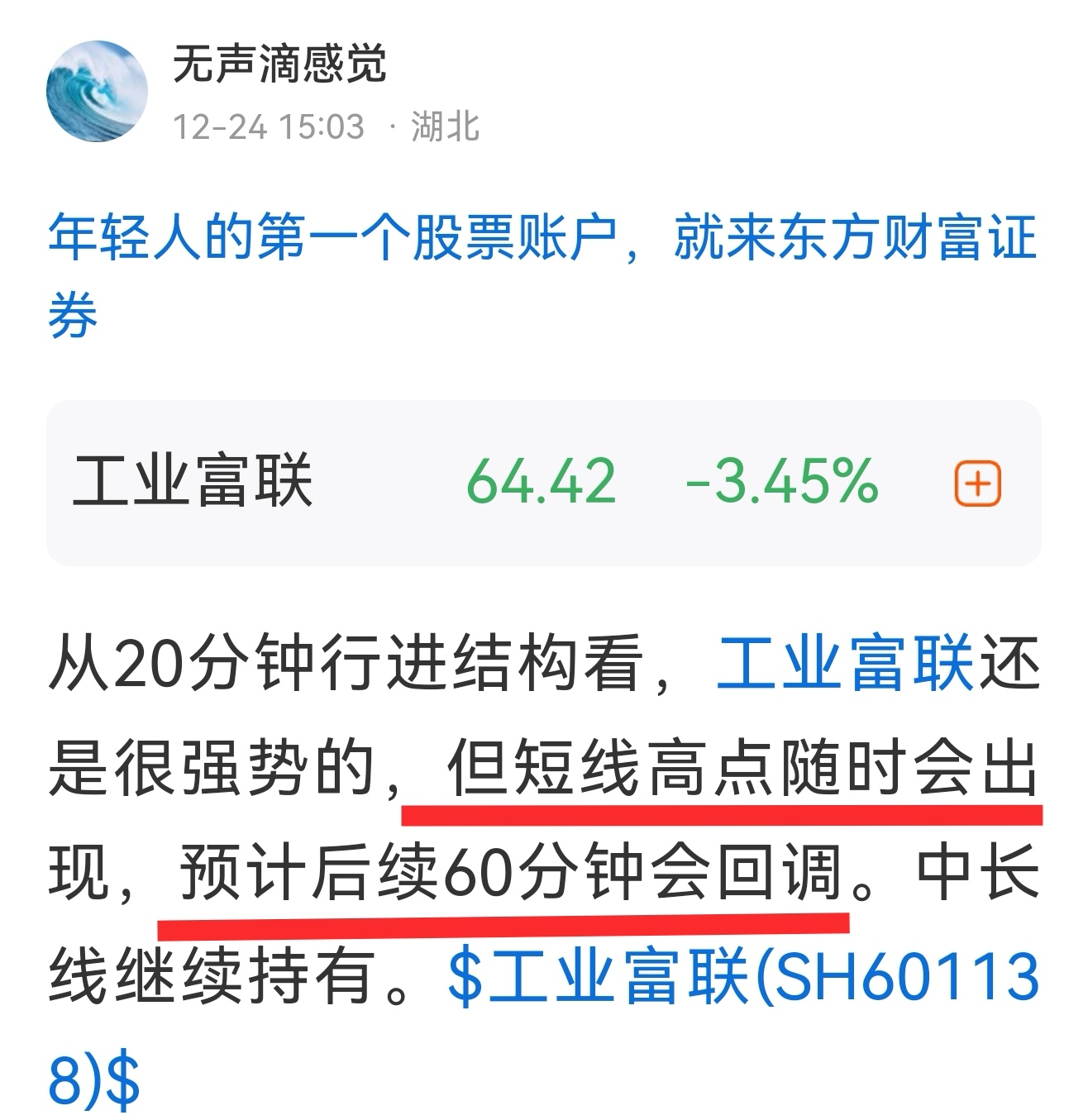 前两天我反复讲了工业富联即将60分钟回调,但很少有人会信,因为看上去涨得挺好的。昨天有粉丝问能不能卖,我说减仓是为了将来买回来,结果她理解为不动,我也是无语得很。当然这是短线,中长线还是问题不大。