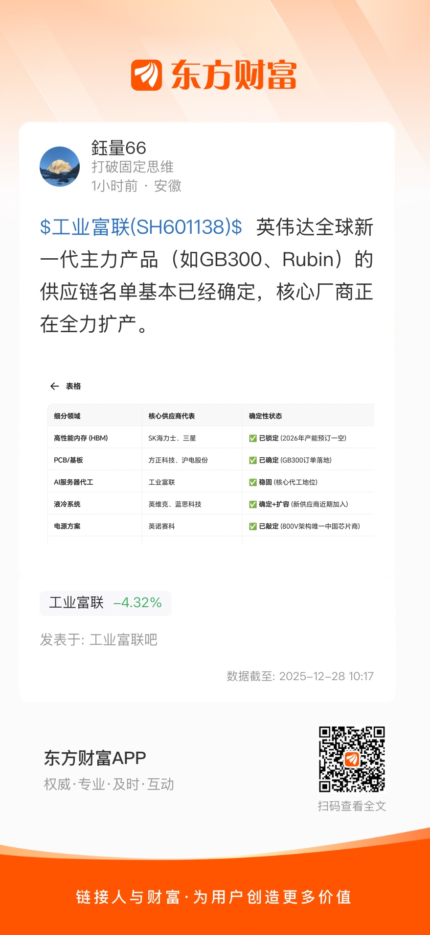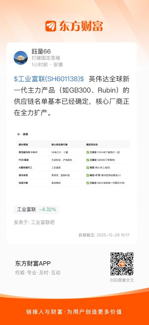 $工业富联(SH601138)$ 英伟达全球新一代主力产品(如GB300、Rubin)的供应链名单基本已经确定,核心厂商正在全力扩产。