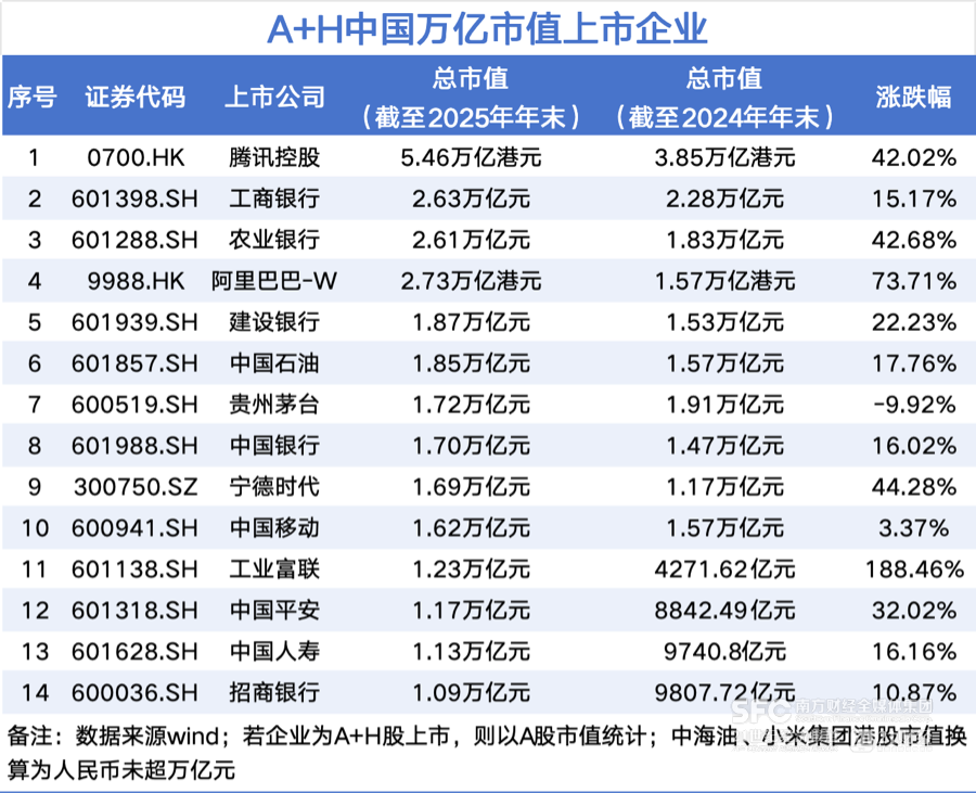 据Wind数据,在A+H股上市的内地公司中,截至2025年末,市值超1万亿元的公司数量已增至14家,较上年末新增4家。同期总市值提升了约超9万亿元,涨幅超50%。