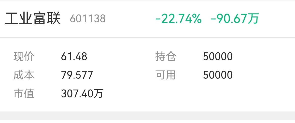 $工业富联(SH601138)$ 套了90多万,咬咬牙割了,买的商业航天股票,挣了80多万,今天我把获利的都了结了,回来买富联,她也该涨了,避险品种,准备吃她的分红前的肉
