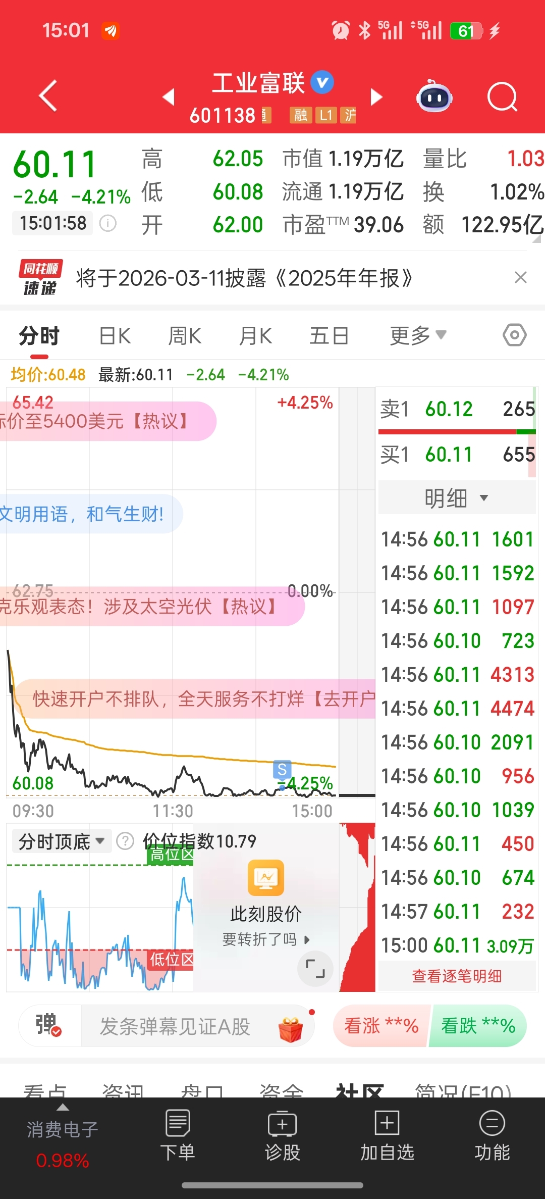 $工业富联(SH601138)$ 59块5买的,63块钱没卖,我都知道工业富联是这个德行,一到63附近就要下跌,非不卖。现在好了,60块2卖了。顶级操作