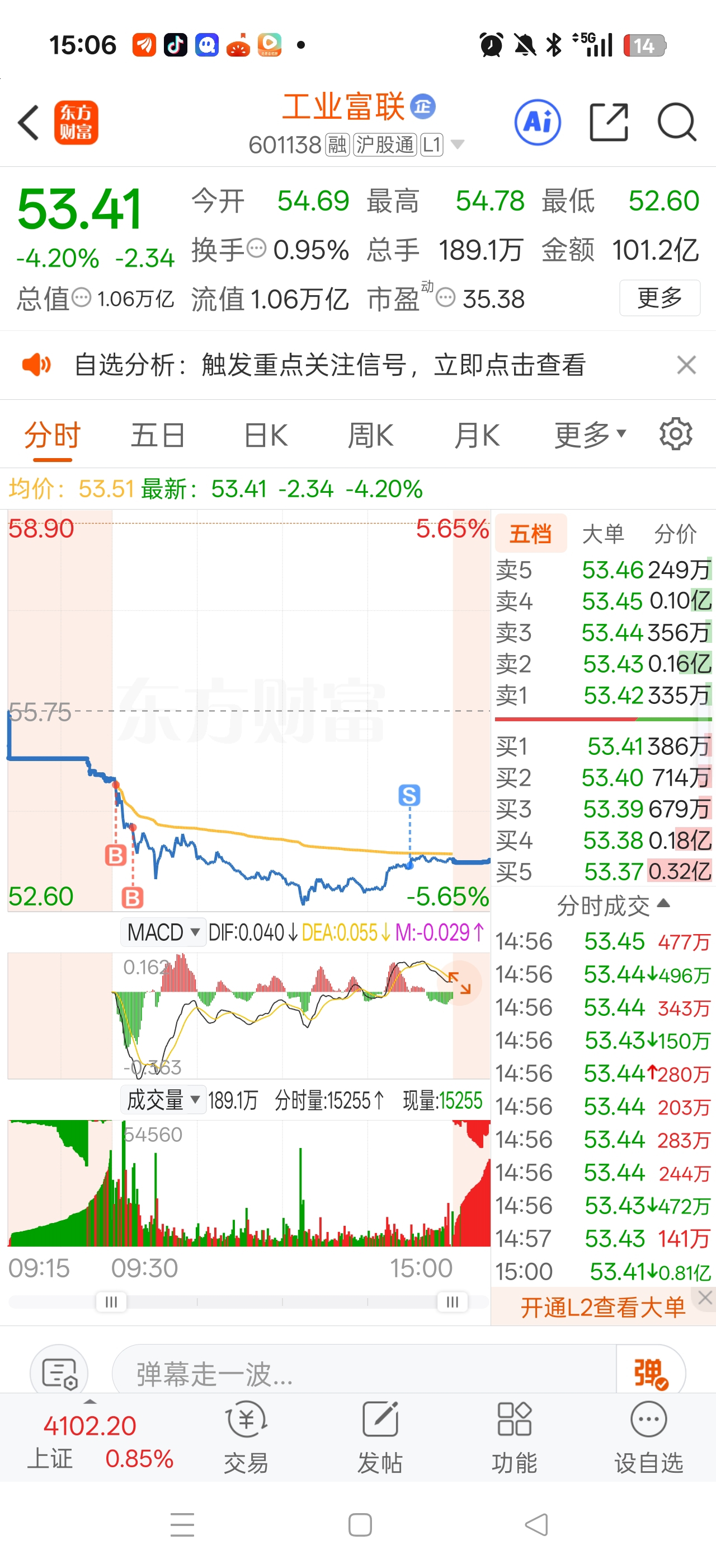 $工业富联(SH601138)$ 吃一堑长一智了,做了个反踢准备,明天如果高开的话给他卖了,不碰这个股了,反弹都不带反弹的,连做t都做不了,今天亏本做t卖了。真受不了,每天下杀都不怎么反弹。从65开始一直补补到53。受不了了,还不到底。