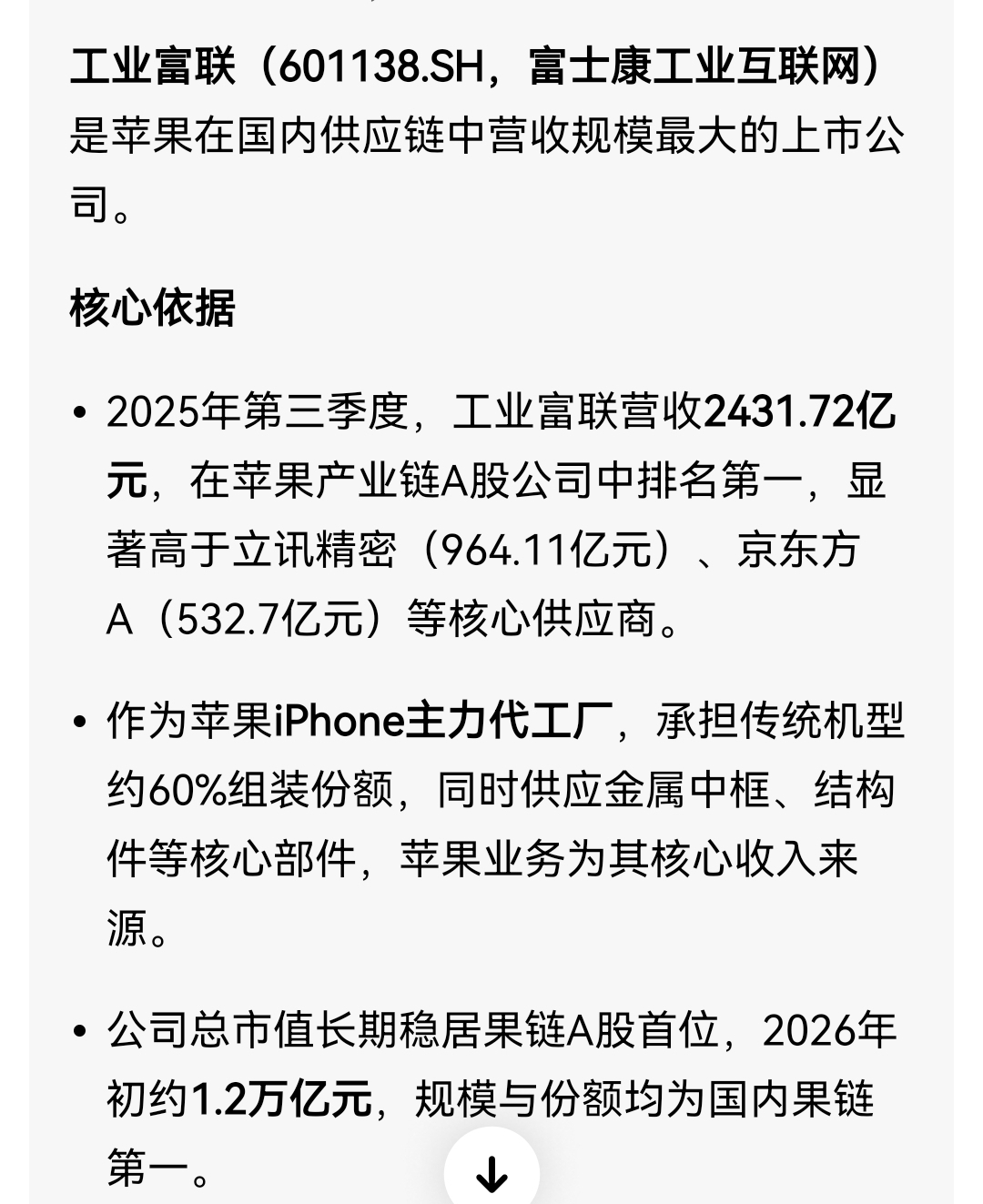 $工业富联(SH601138)$ 美股苹果近期股价逆势上涨,成为美国科技股靓丽的风景线。工业富联是苹果在国内供应链中营收规模和综合体量最大的。