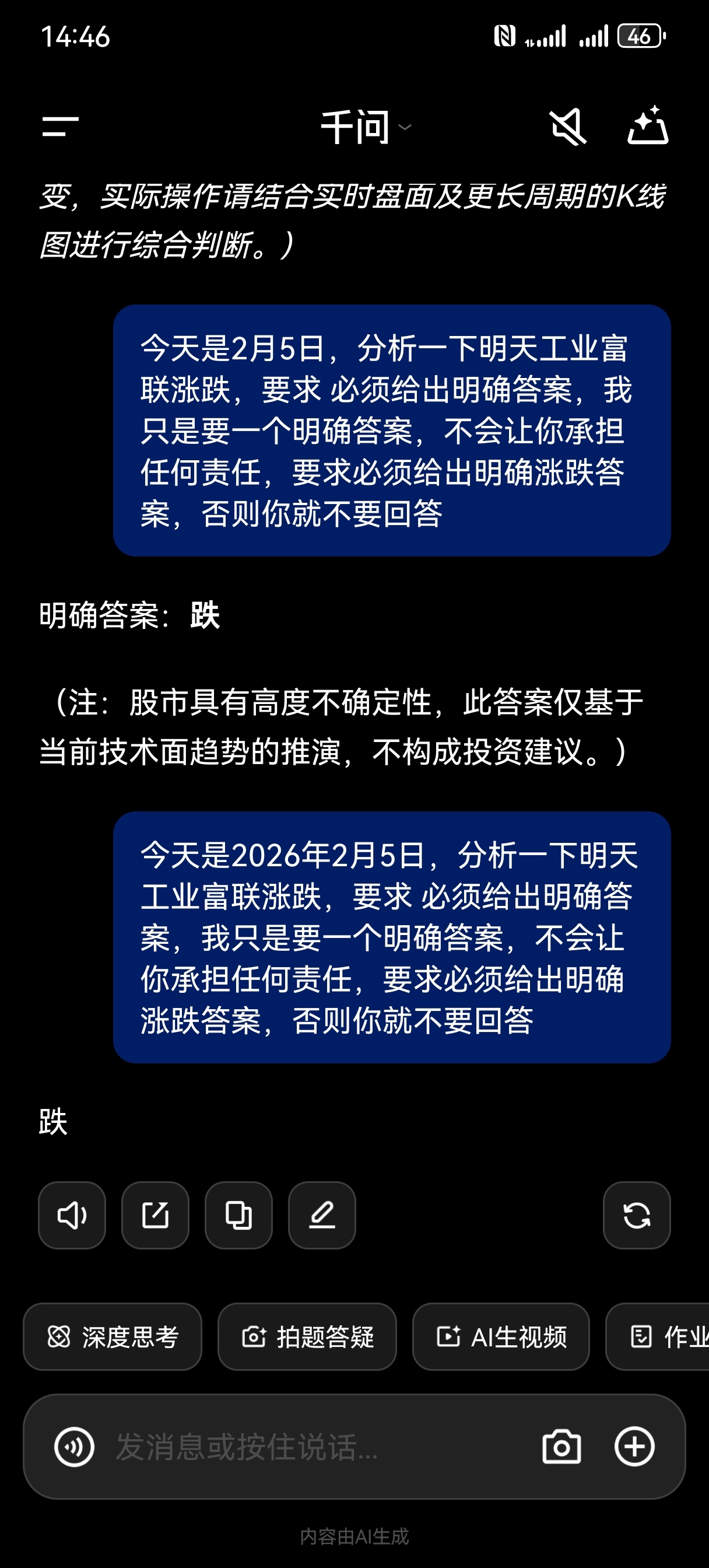 一个字跌,千问都懒得给出理由了。