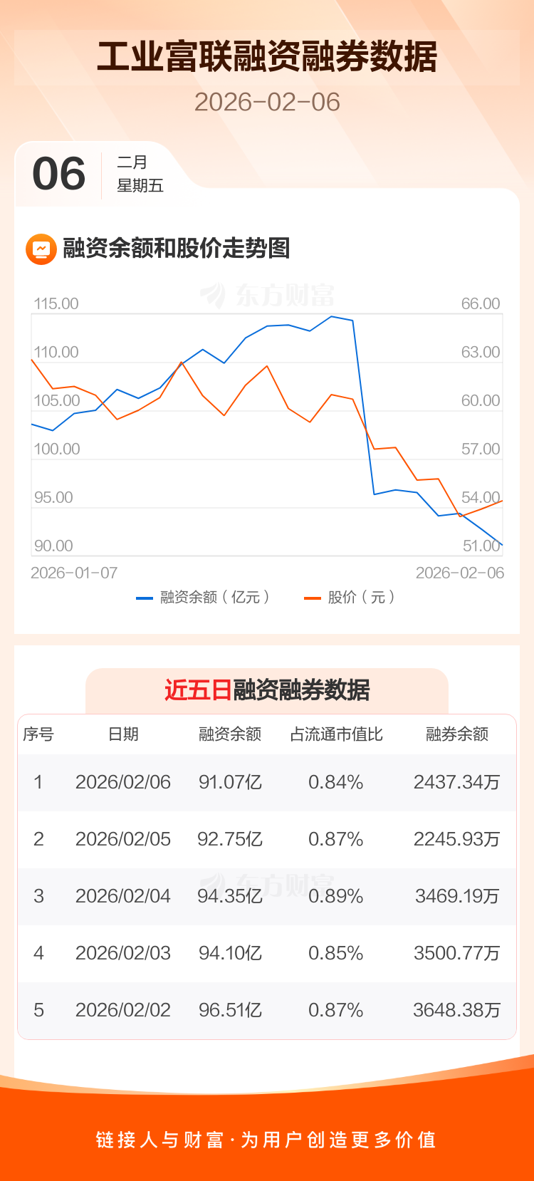 交易所最新数据显示,工业富联于2026年2月6日获融资买入4.88亿元,融资偿还6.57亿元,当日融资净偿还1.69亿元。目前,该股融资余额91.07亿,占流通市值比例为0.84%。