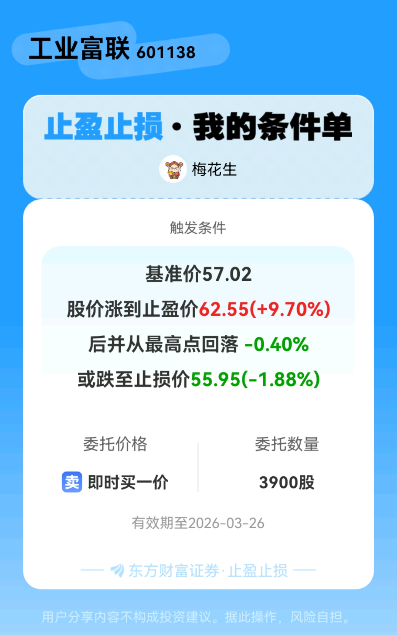 #条件单交流# #止盈止损晒单# 一位股神设置了一个止盈止损条件单,接下来就是见证奇迹的时刻~$工业富联(SH601138)$