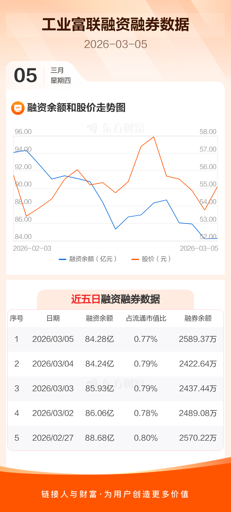 交易所最新数据显示,工业富联于2026年3月5日获融资买入5.00亿元,融资偿还4.96亿元,当日融资净买入387.65万元。目前,该股融资余额84.28亿,占流通市值比例为0.77%。