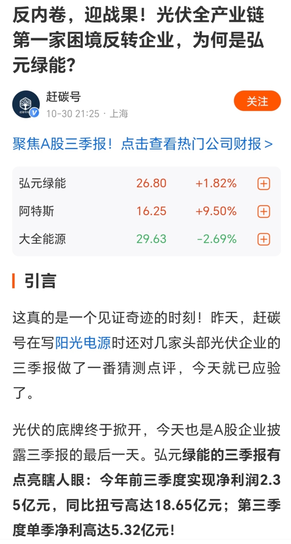 $深圳燃气(SH601139)$  光伏产业业绩反转来了!弘元绿能前三季度实现净利润2.3 5亿元,同比扭亏高达18.65亿元;第三季度单季净利高达5.32亿元!深圳燃气的光伏子公司斯威克让人充满信心了!