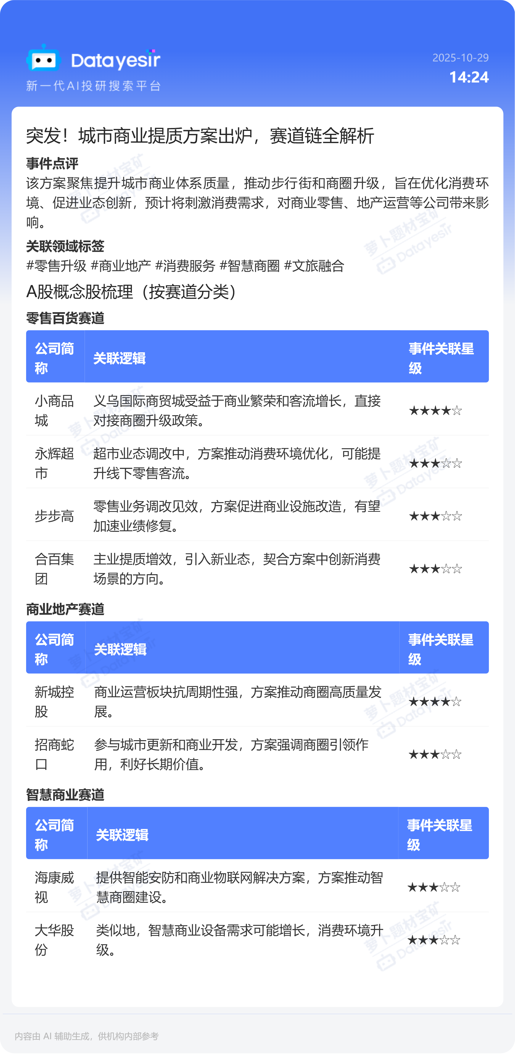 《城市商业提质行动方案》印发,该方案聚焦提升城市商业体系质量,推动步行街和商圈升级,旨在优化消费环境、促进业态创新,预计将刺激消费需求。