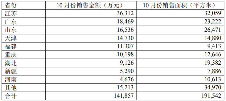 在销售方面,10月份公司实现合同销售金额约14.19亿元,销售面积约19.15万平方米。1-10月累计合同销售金额约164.68亿元,累计合同销售面积约215.06万平方米。各区域的销售情况中,江苏省销售金额为3.63亿元,销售面积为3.21万平方米,表现较为突出。具体情况如下: