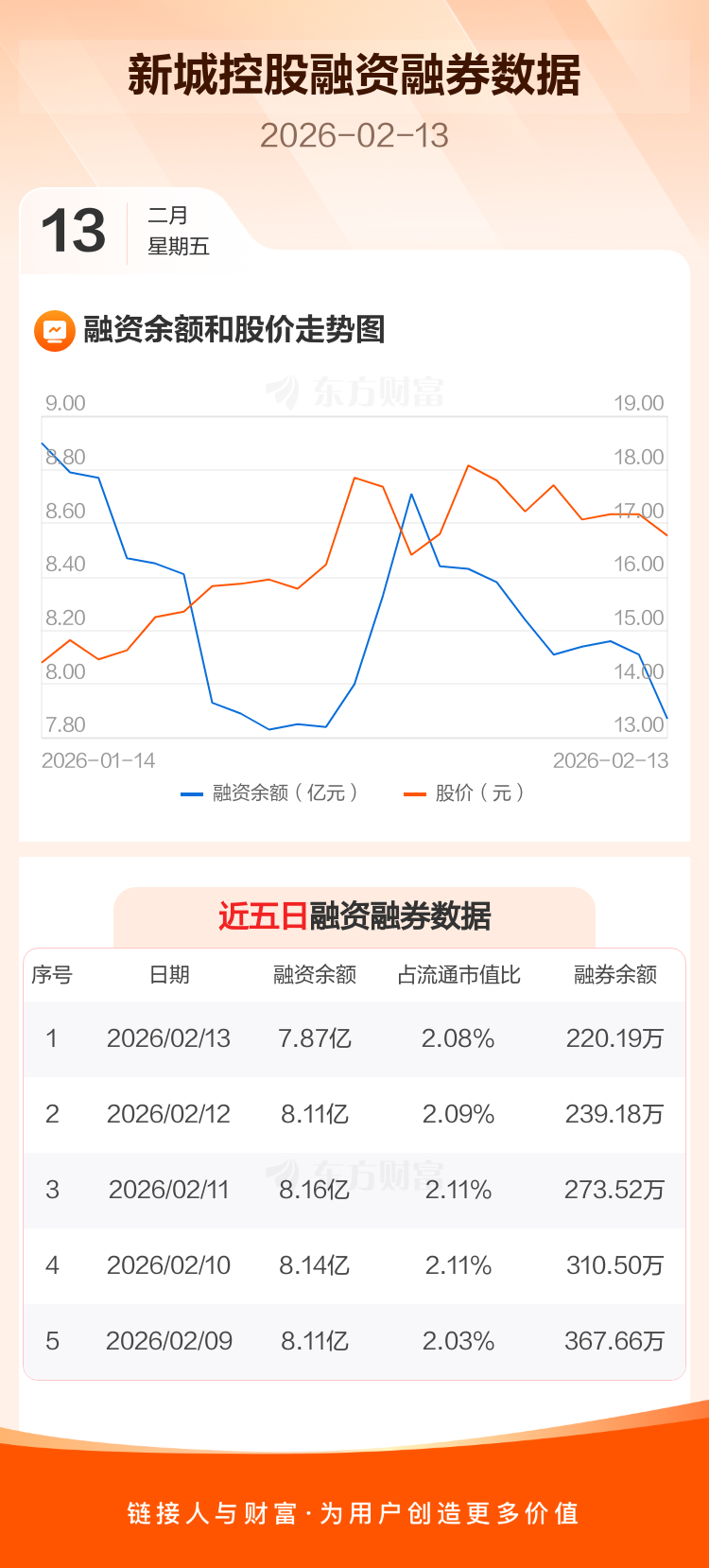 交易所最新数据显示,新城控股于2026年2月13日获融资买入2170.74万元,融资偿还4536.79万元,当日融资净偿还2366.04万元。目前,该股融资余额7.87亿,占流通市值比例为2.08%。
