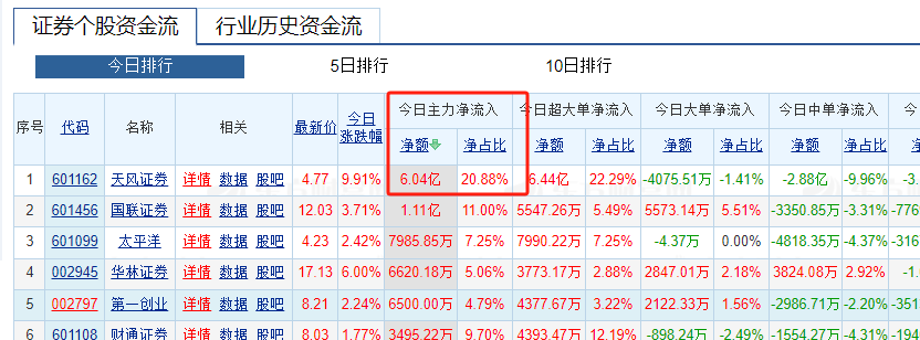 天风主力净流入占比20.88%,决心很大啊。十日净流入排行也是天风。