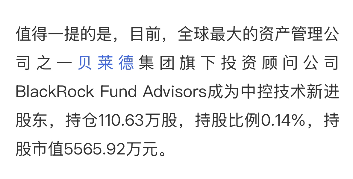 $中控技术(SH688777)$  外资贝莱德进场了?