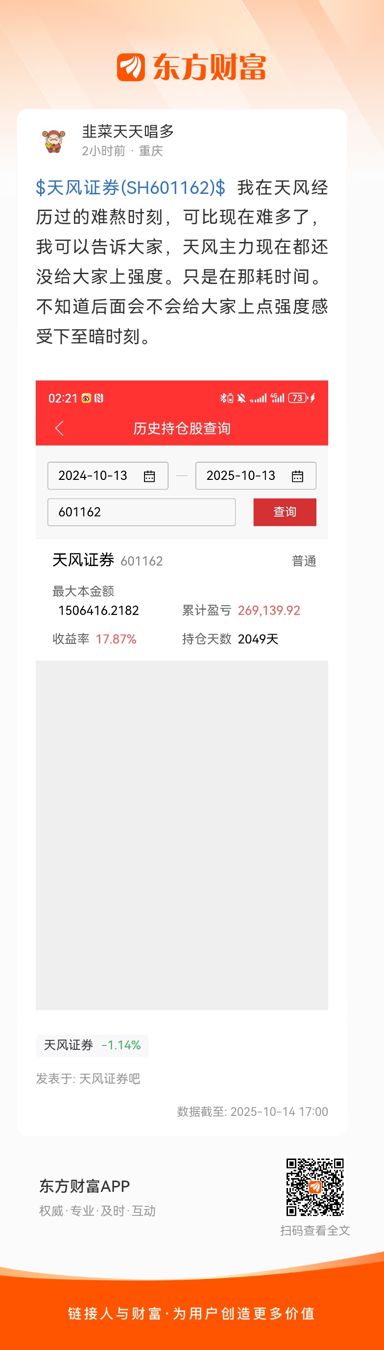 $天风证券(SH601162)$ 我在天风经历过的难熬时刻,可比现在难多了,我可以告诉大家,天风主力现在都还没给大家上强度。只是在那耗时间。不知道后面会不会给大家上点强度感受下至暗时刻。