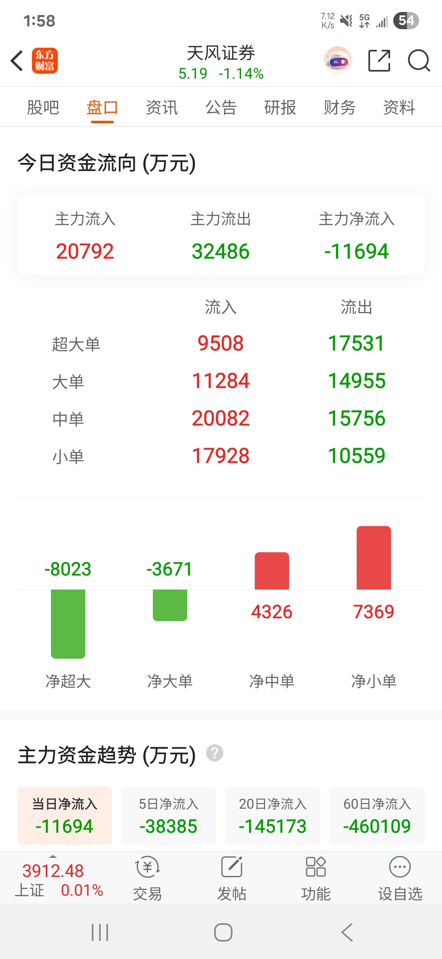 $天风证券(SH601162)$ 成交5个亿就跑了一个亿