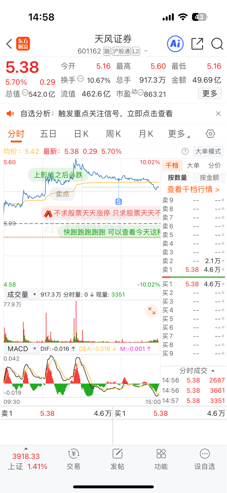 $天风证券(SH601162)$ 哎 人真的不能贪心 高位没卖 低位卖了一半 还剩一半