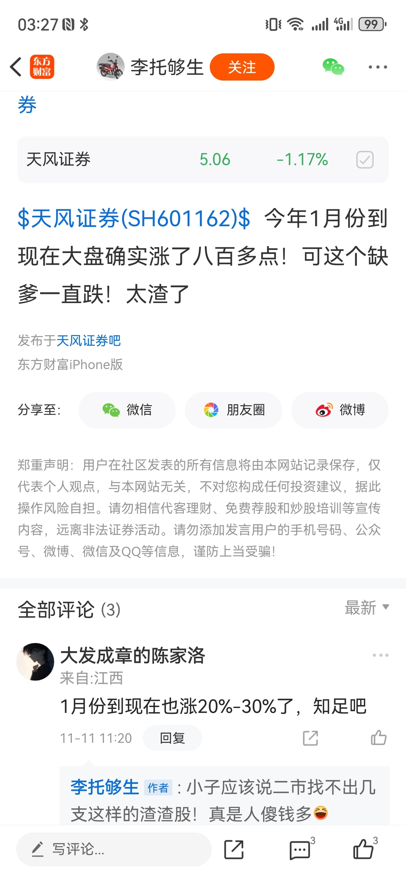 $天风证券(SH601162)$ 哈哈,这个李托够生,本金少,认知低,格局小,想挣快钱,看了下记录,应该是去年924之后,进来高位接了盘,每天想解套,主力又不拉,就玩他,每天气急败坏呢。他的确惨。