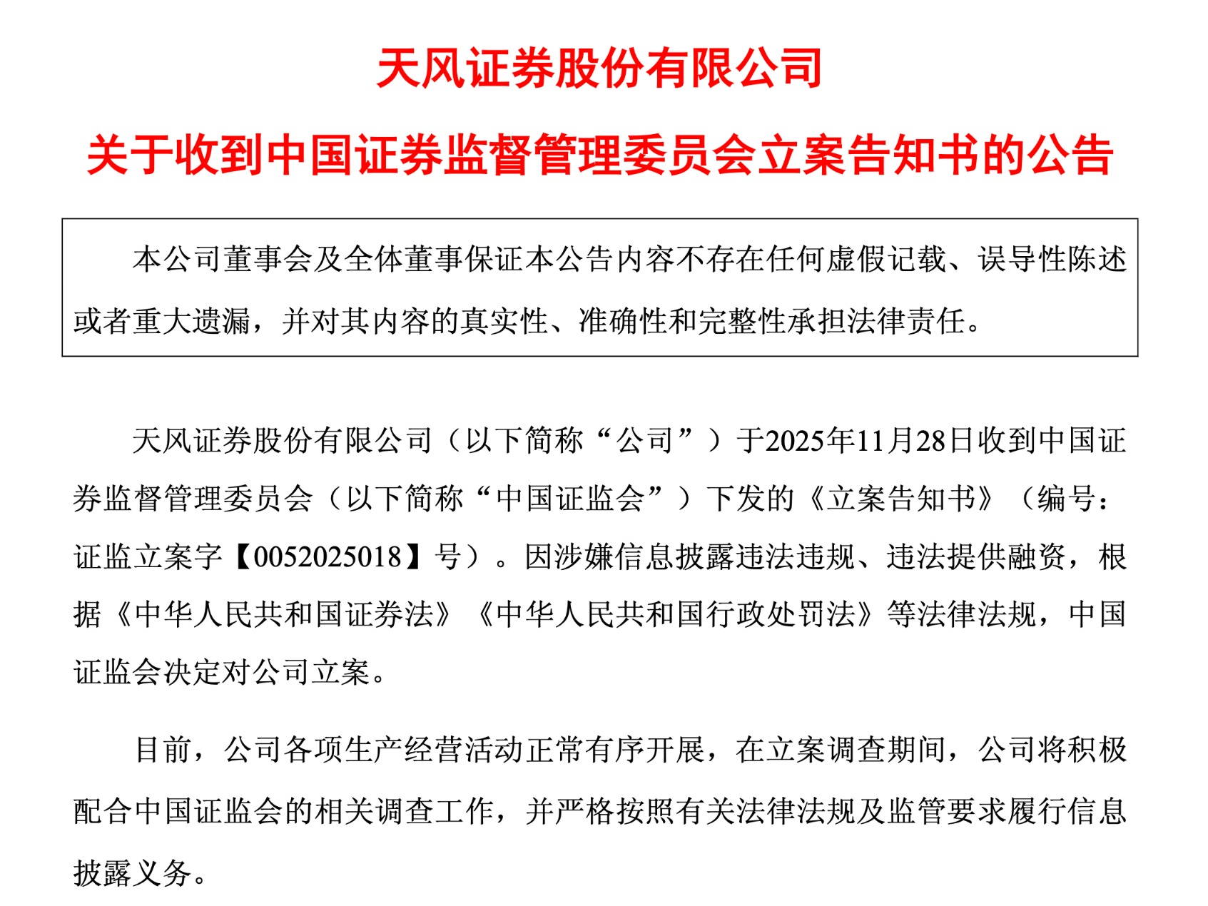 蓝鲸新闻11月28日讯(记者王婉莹)今日晚间,天风证券(601162.SH)公告,公司收到证监会下发的《立案告知书》,因涉嫌信息披露违法违规、违法提供融资,证监会决定对公司立案。
